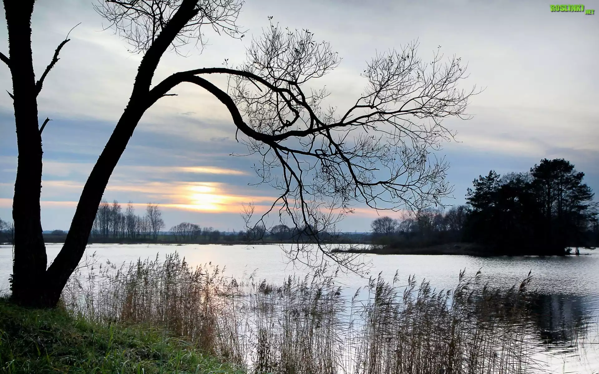 Rośliny: Jezioro, Wysepka, Drzewa, Trawy, Wschód, Słońca