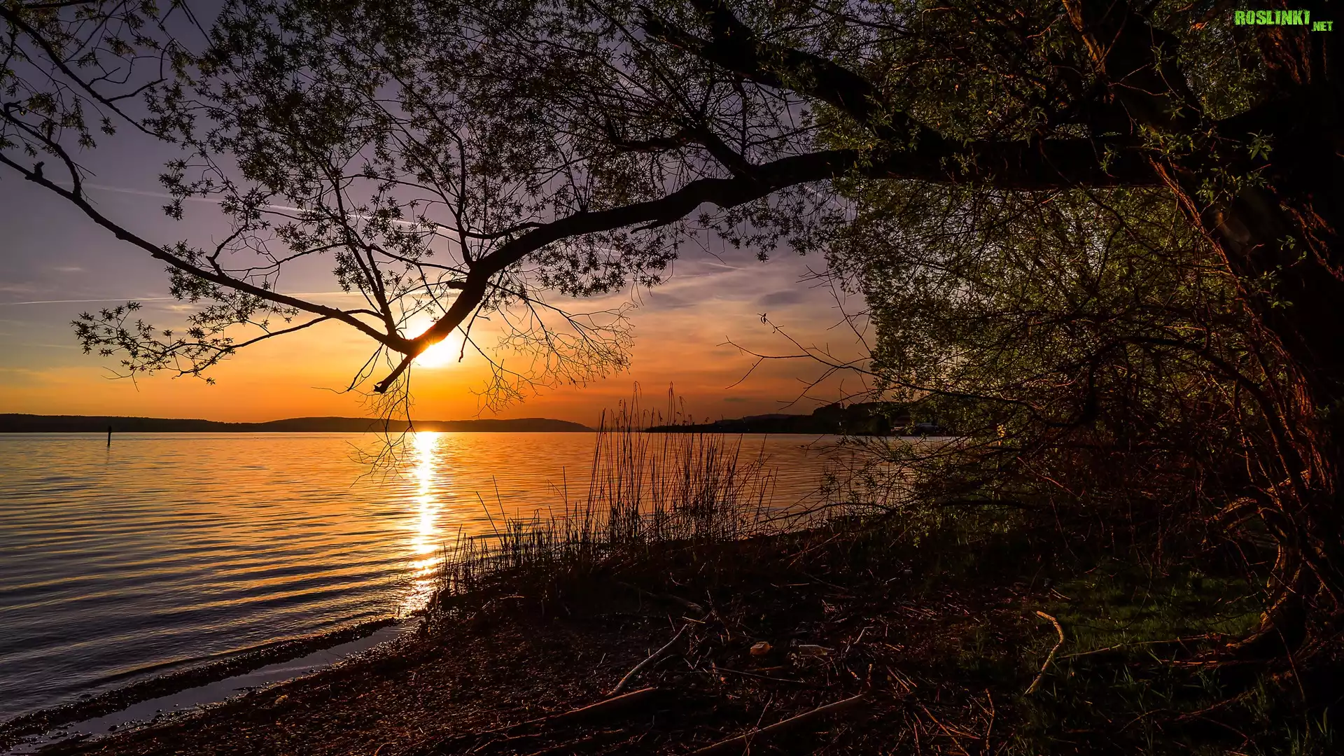 Rośliny: Jezioro, Drzewa, Gałęzie, Trawa, Zachód słońca
