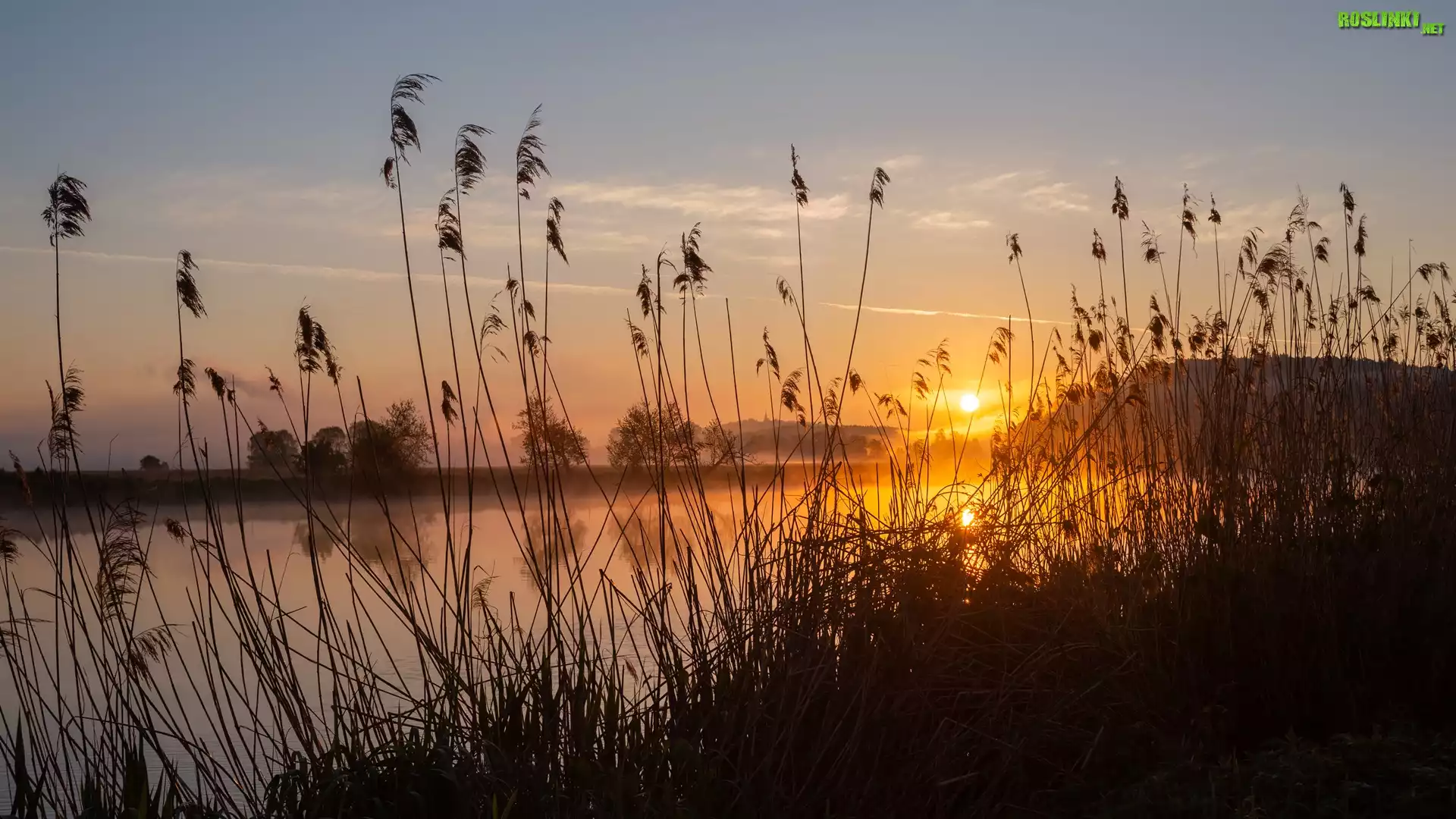 Jezioro, Trawa, Szuwary, Zachód słońca