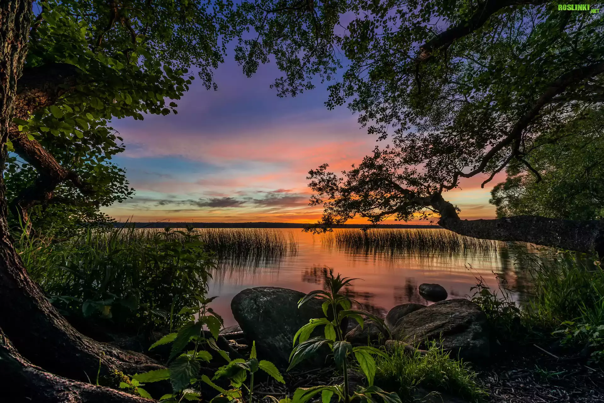 Jezioro, Kamienie, Trzciny, Drzewa, Zachód, Słońca