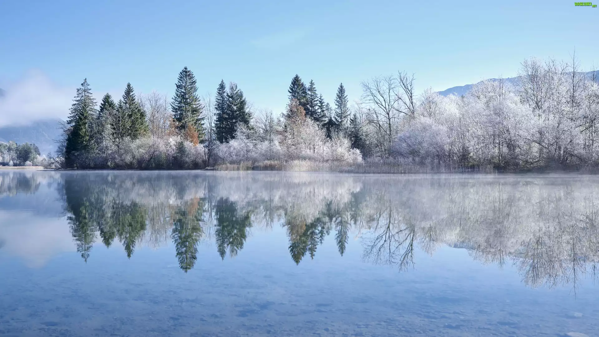 Rośliny: Jezioro, Drzewa, Śnieg, Odbicie, Zima, Góry