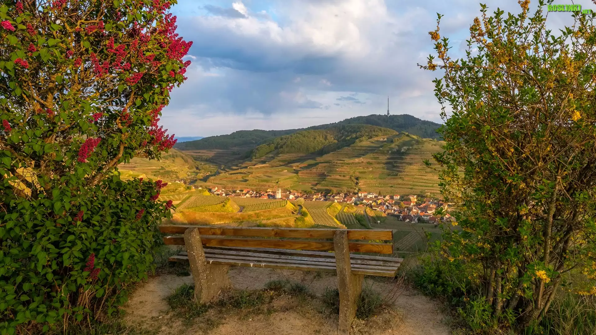 Rośliny: Wzgórza, Kaiserstuhl, Drzewa, Ławka, Domy, Chmury, Vogtsburg, Niemcy
