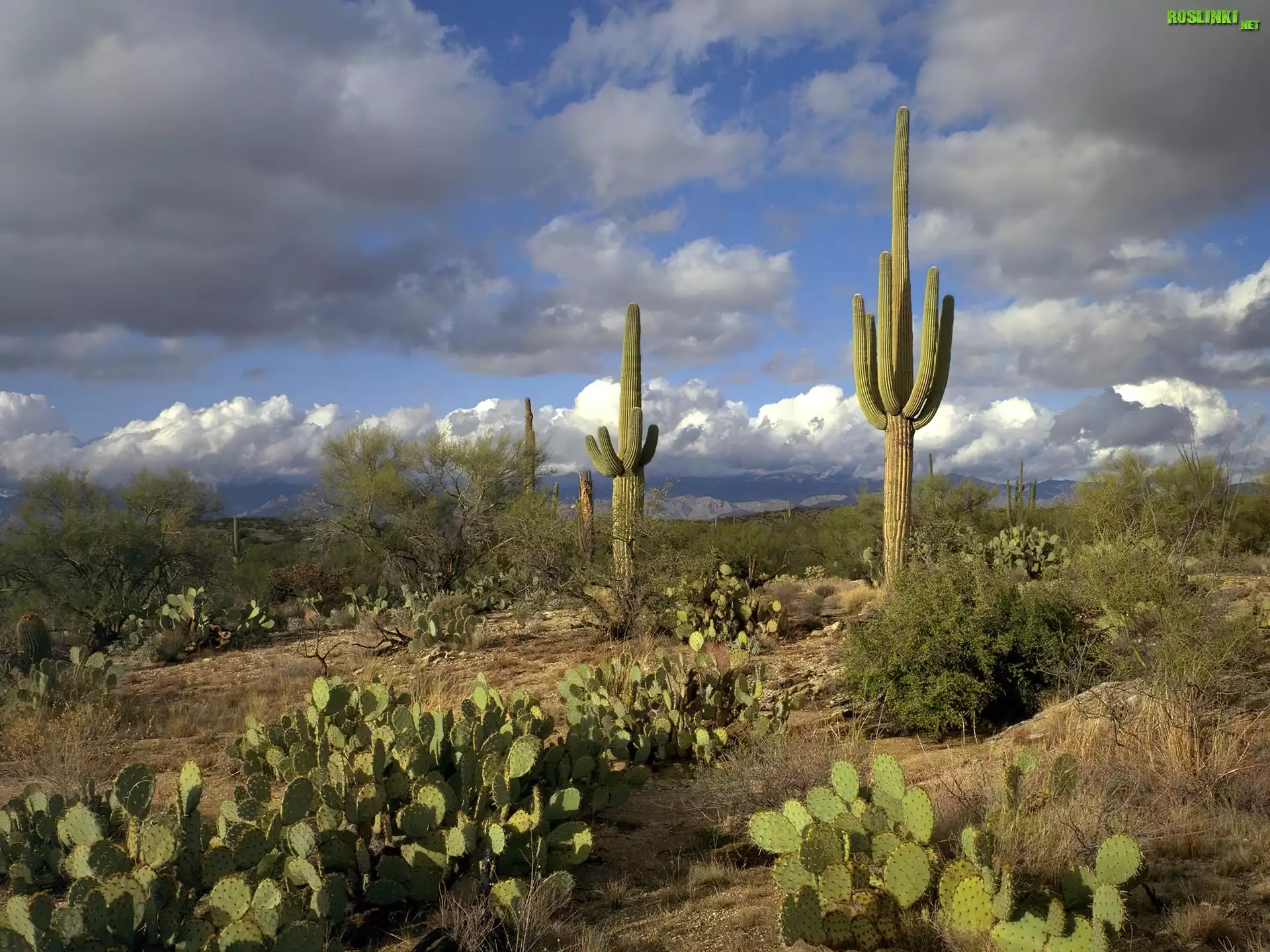 Pustynia, Kaktusy, Opuncje, Karnegia olbrzymia, Saguaro, Chmury, Park Narodowy Saguaro, Stan Arizona, Stany Zjednoczone |