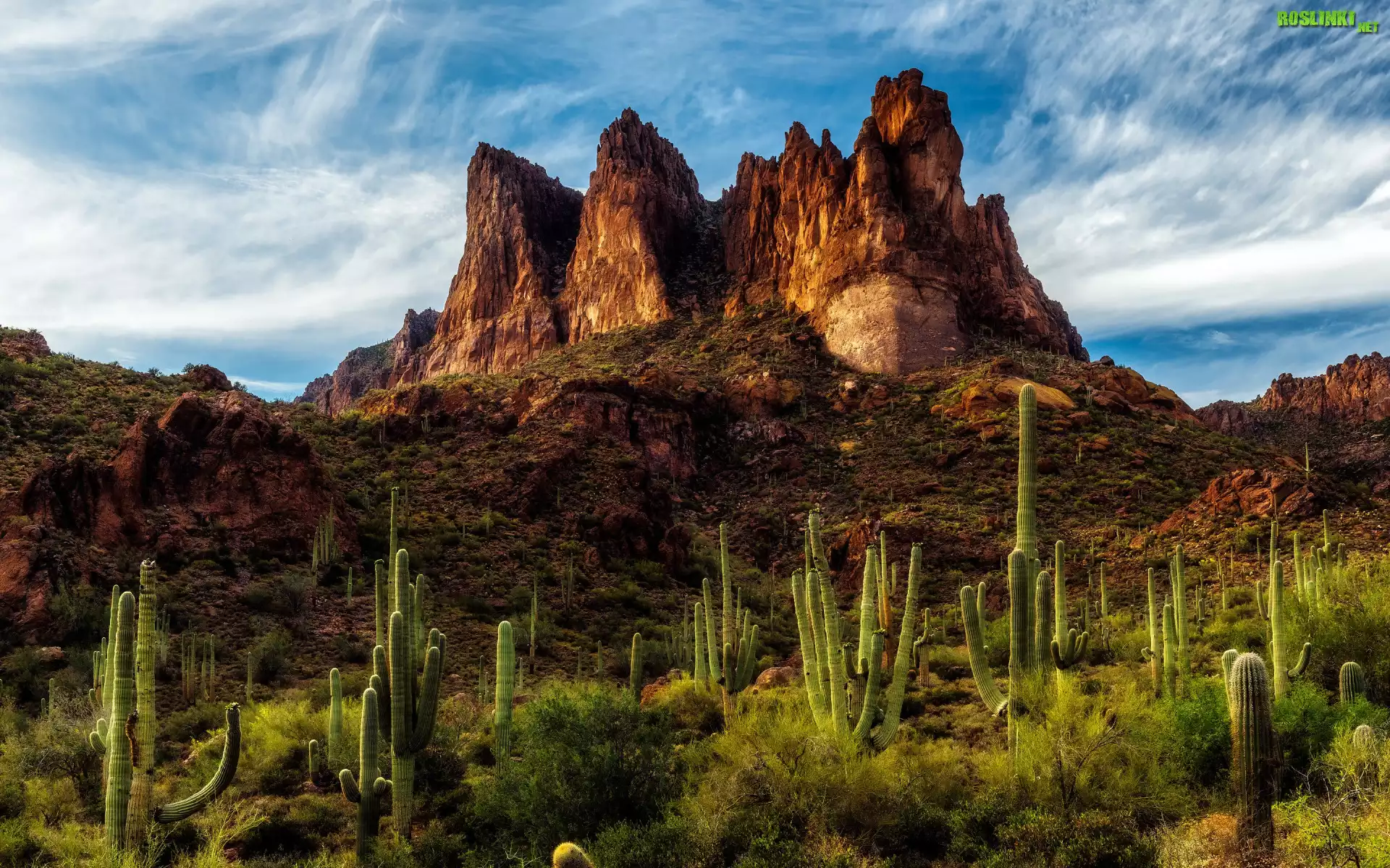 Stany Zjednoczone, Arizona, Pustynia, Sonoran Desert, Góry, Superstition Mountains, Szczyty, Tree Sisters, Skały, Kaktusy saguaro, Rośliny, Chmury |