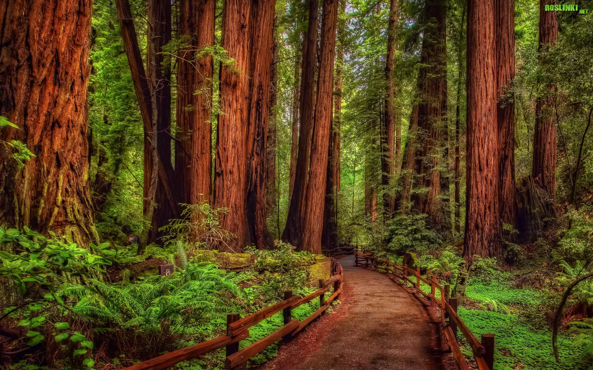 Rośliny: Stany Zjednoczone, Kalifornia, Las, Drzewa, Sekwoje, Paprocie, Droga, Park Narodowy Redwood