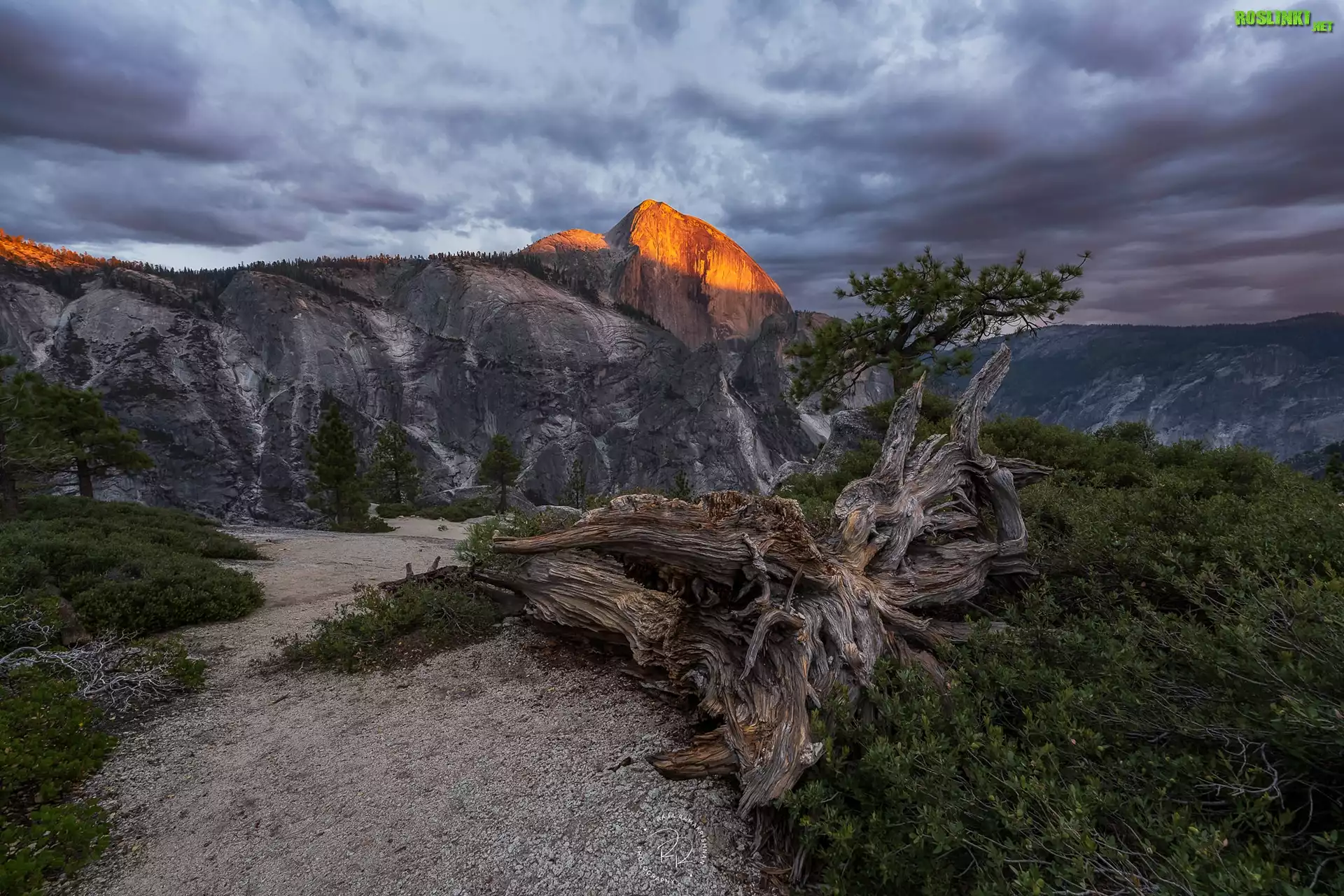 Rośliny: Góry, Szczyt Half Dome, Drzewa, Konar, Park Narodowy Yosemite, Kalifornia, Stany Zjednoczone