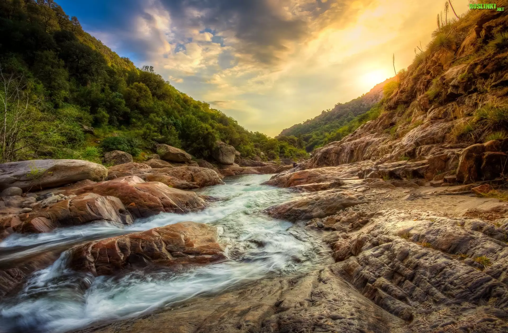 Stany Zjednoczone, Kalifornia, Park Narodowy Sekwoi, Rzeka Kaweah River, Skały, Drzewa