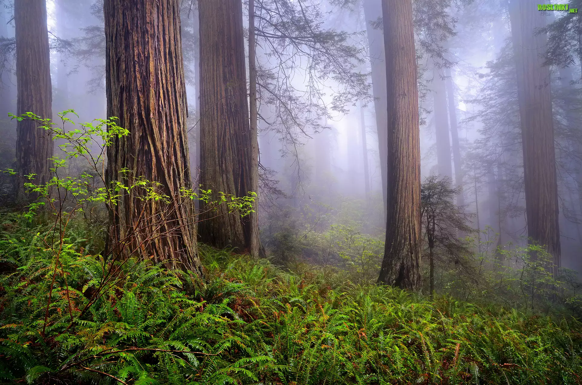 Rośliny: Stany Zjednoczone, Kalifornia, Park Narodowy Redwood, Las, Drzewa, Mgła, Paprocie, Sekwoje