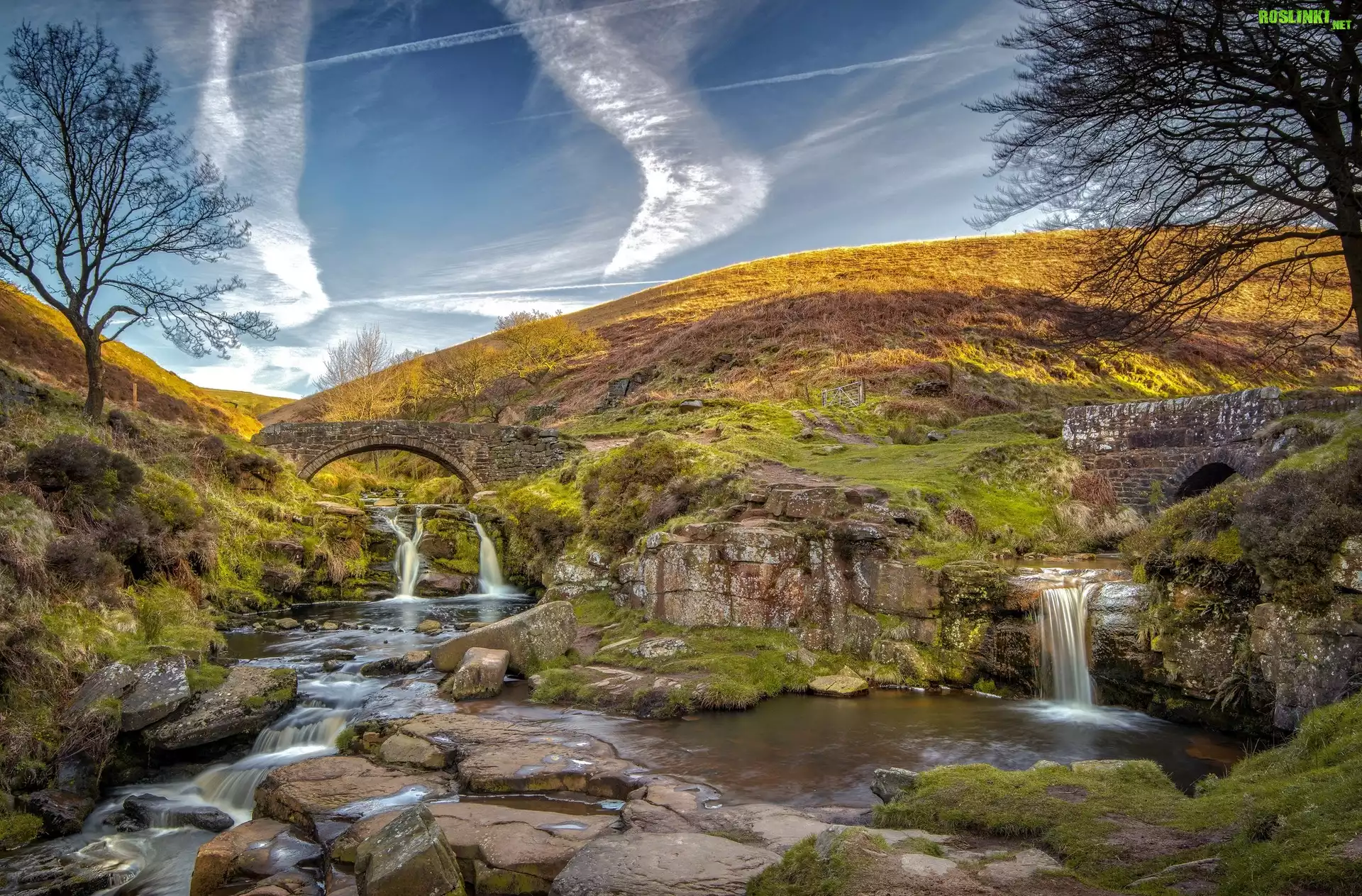 Rośliny: Anglia, Three Shire Heads, Wzgórza, Kamienie, Skała, Most, Rzeka Dane, Drzewa, Chmury
