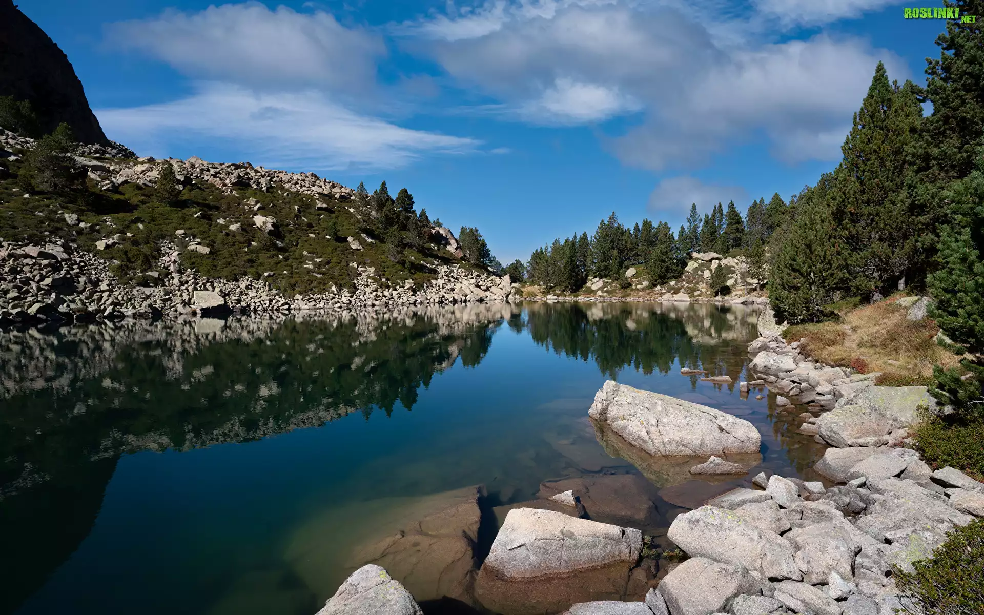 Rośliny: Góry, Jezioro, Drzewa, Kamienie, Niebo, Chmury