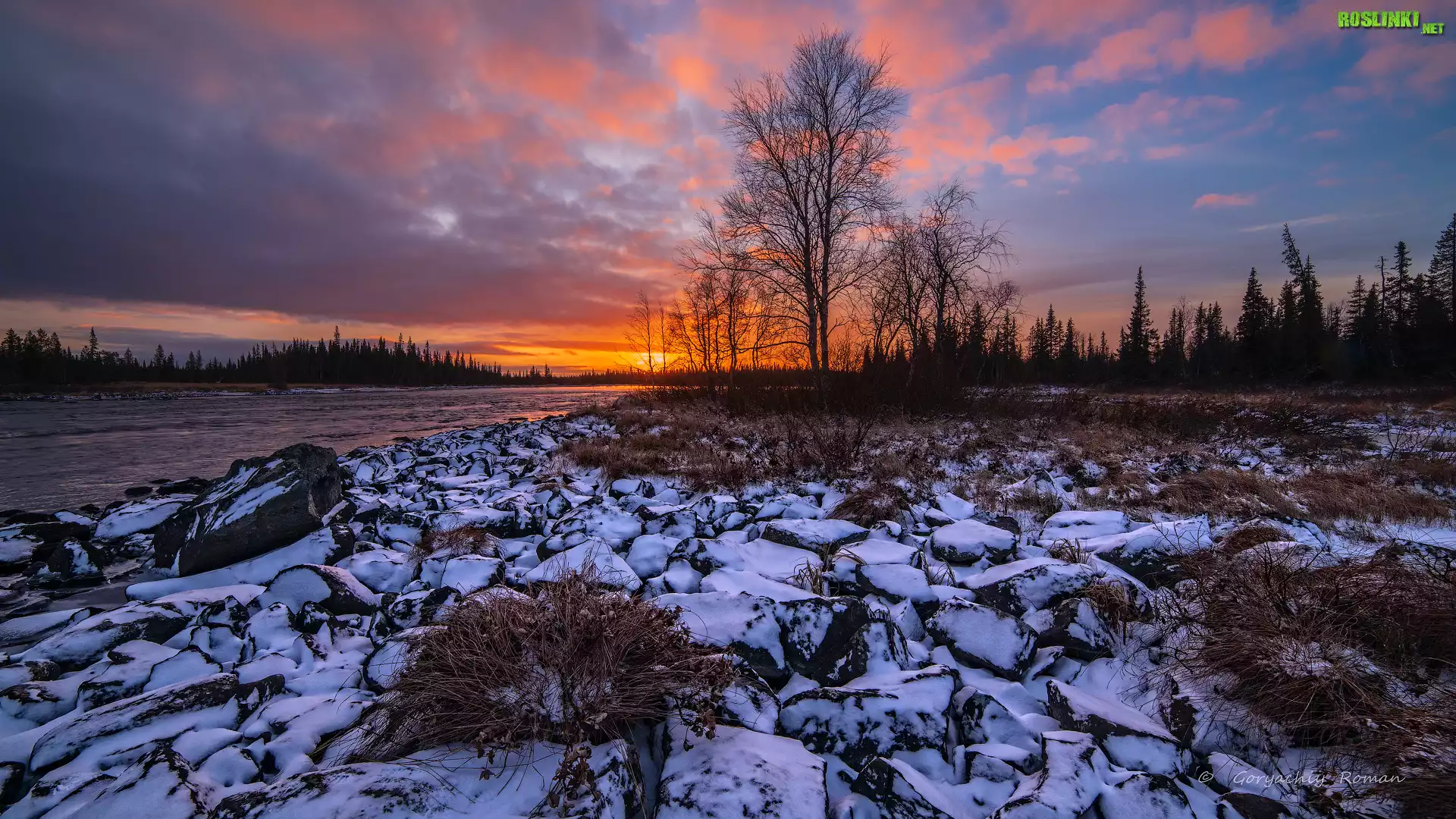 Rzeka Umba, Kamienie, Drzewa, Chmury, Zachód słońca, Półwysep Kolski, Obwód murmański, Rosja |