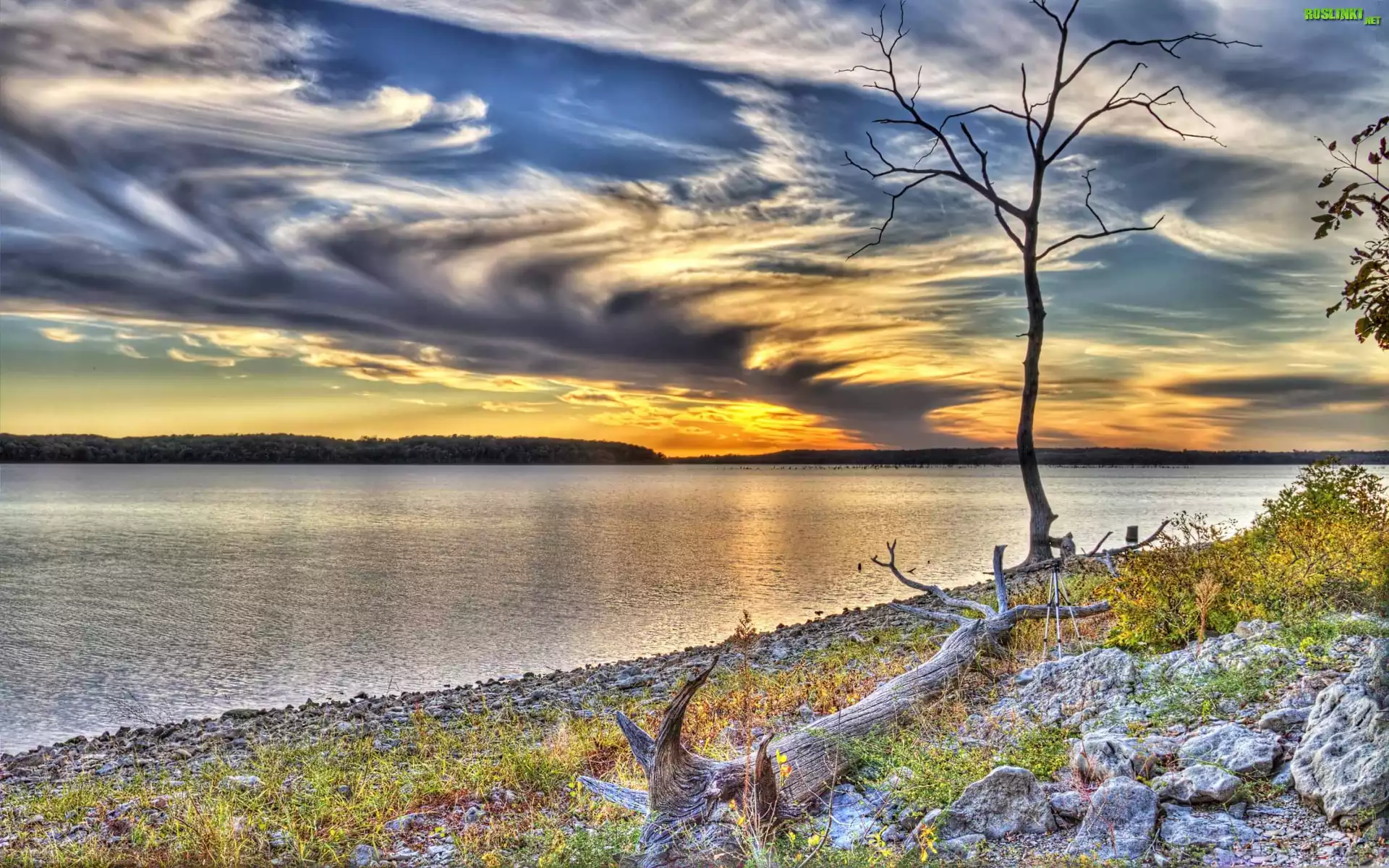 Rośliny: Jezioro, Kamienie, Niebo, Zachód słońca, Drzewa, Roślinność