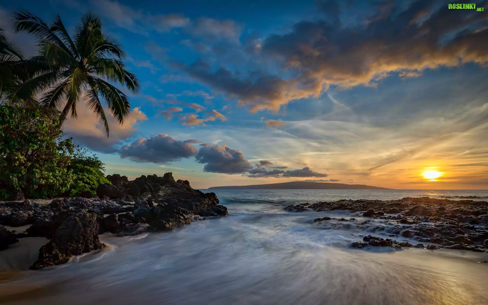 Rośliny: Morze, Brzeg, Palmy, Kamienie, Niebo, Zachód słońca
