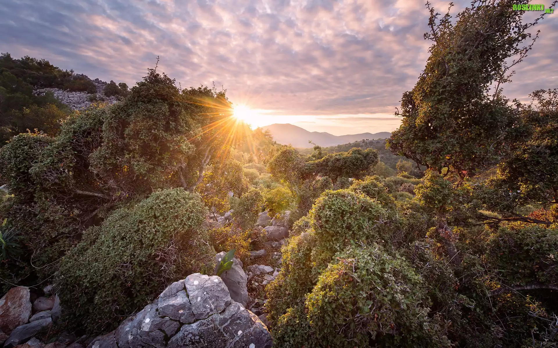 Wzgórza, Drzewa, Roślinność, Kamienie, Promienie słońca, Chmury