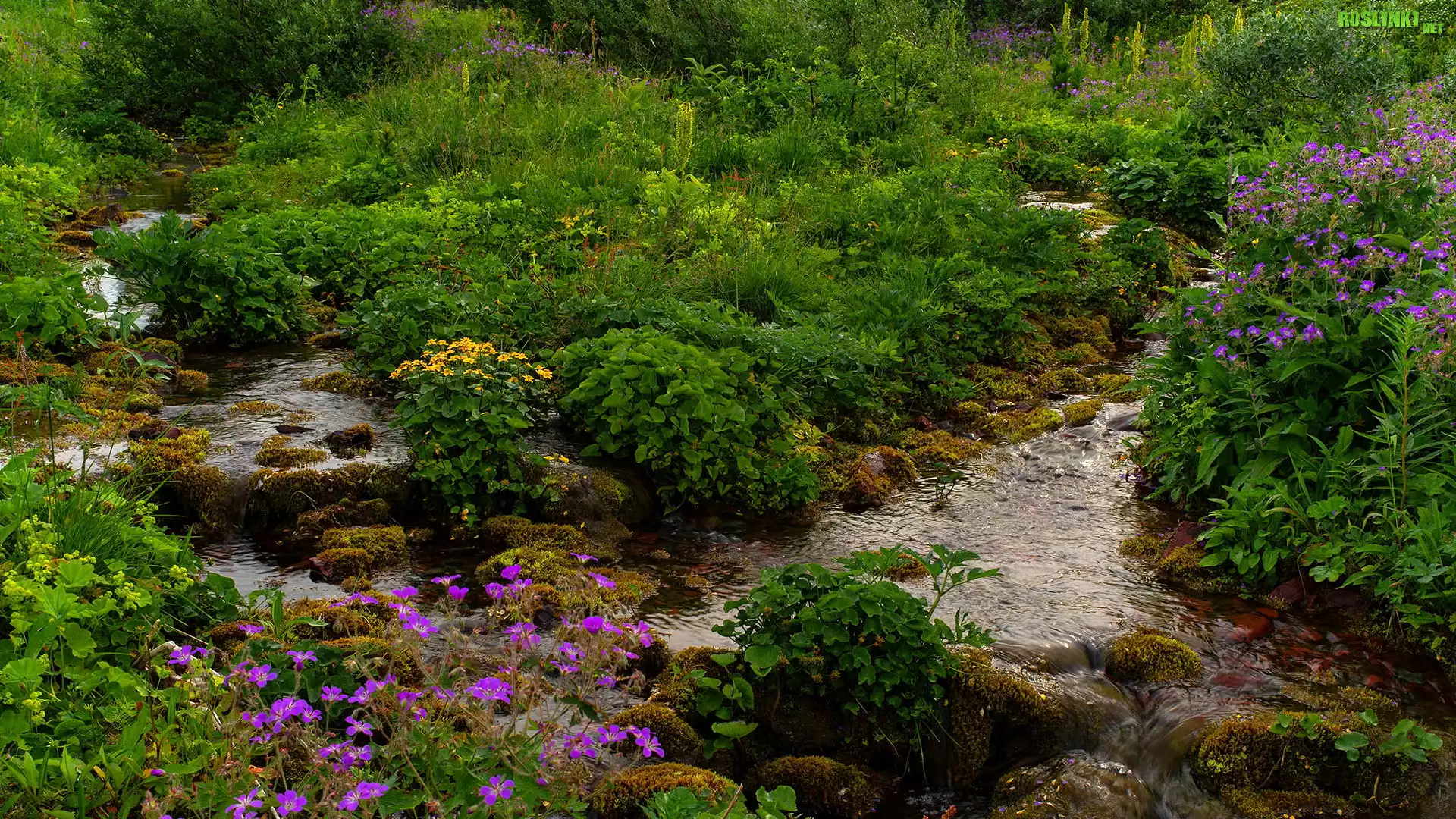 Rośliny: Wiosna. Wzgórze, Rzeczka, Potok, Roślinność, Krzewy, Kwiaty, Omszałe, Kamienie
