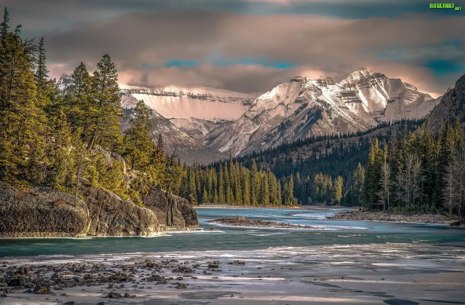 Rośliny: Rzeka, Kamienie, Góry, Las, Drzewa, Zachmurzone, Niebo