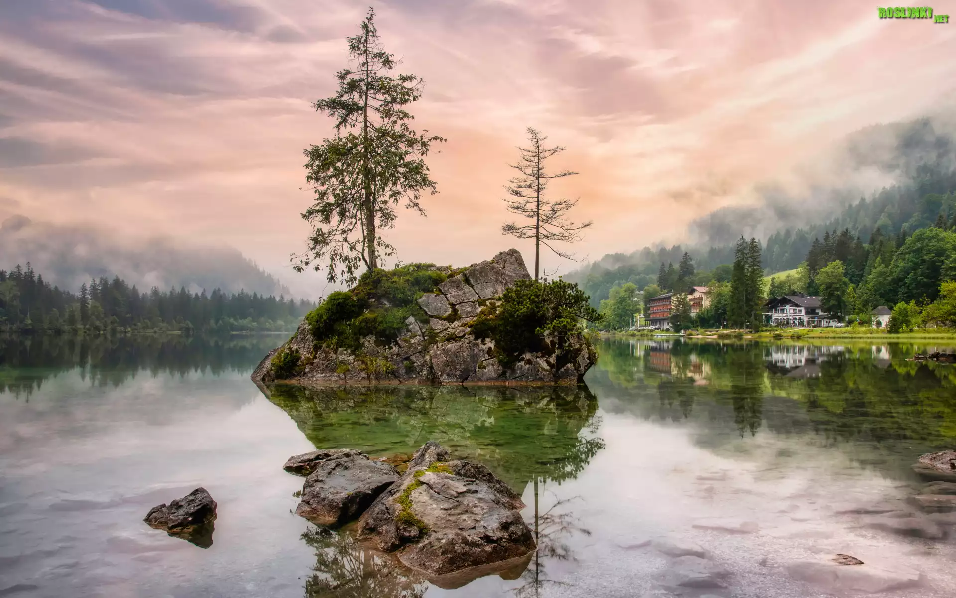 Drzewa, Mgła, Jezioro Hintersee, Skała, Góry, Alpy, Odbicie, Kamienie, Brzeg, Domy, Poranek, Bawaria, Niemcy |