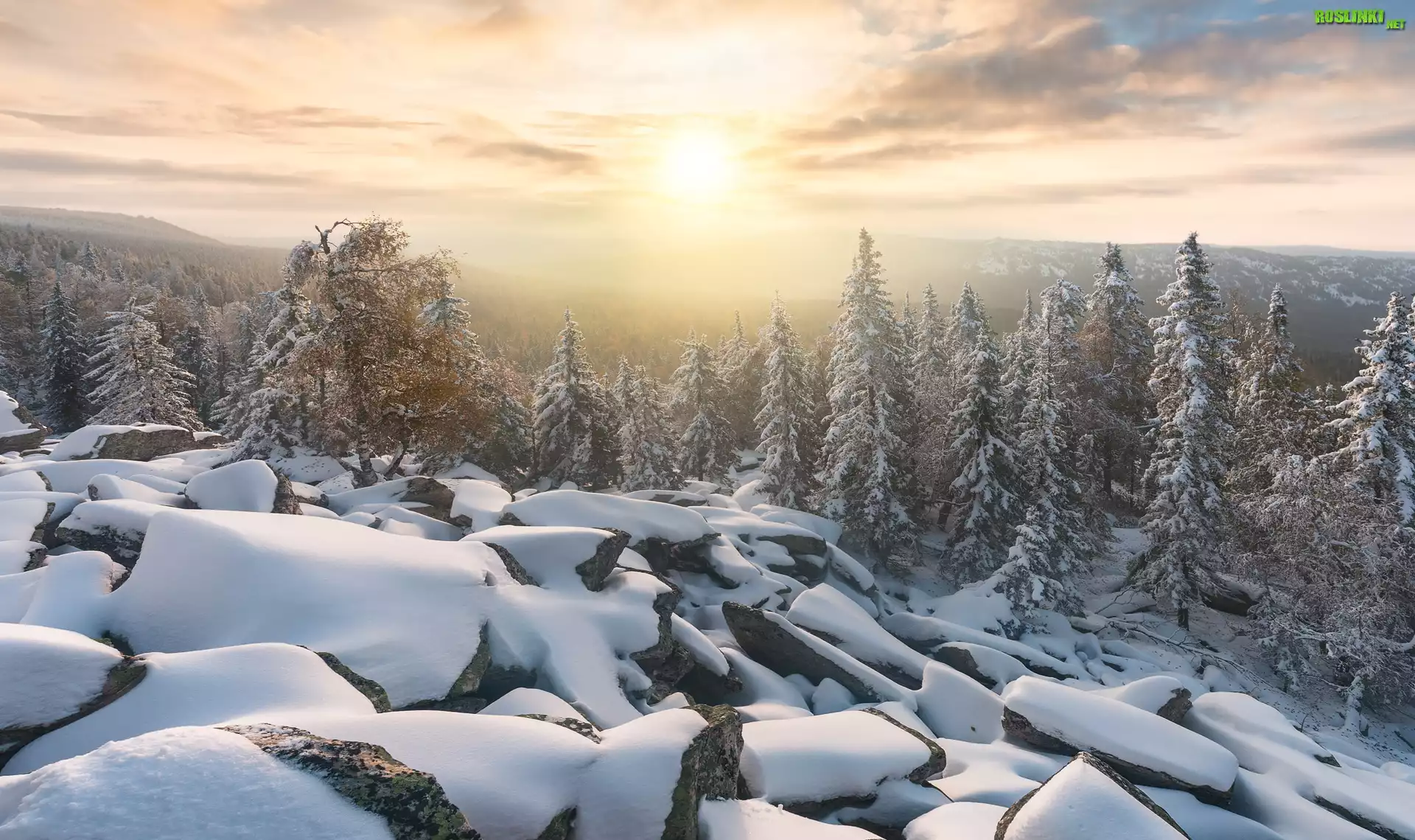 Zima, Śnieg, Kamienie, Drzewa, Świerki, Góry, Mgła, Słońce, Południowy Ural, Rosja