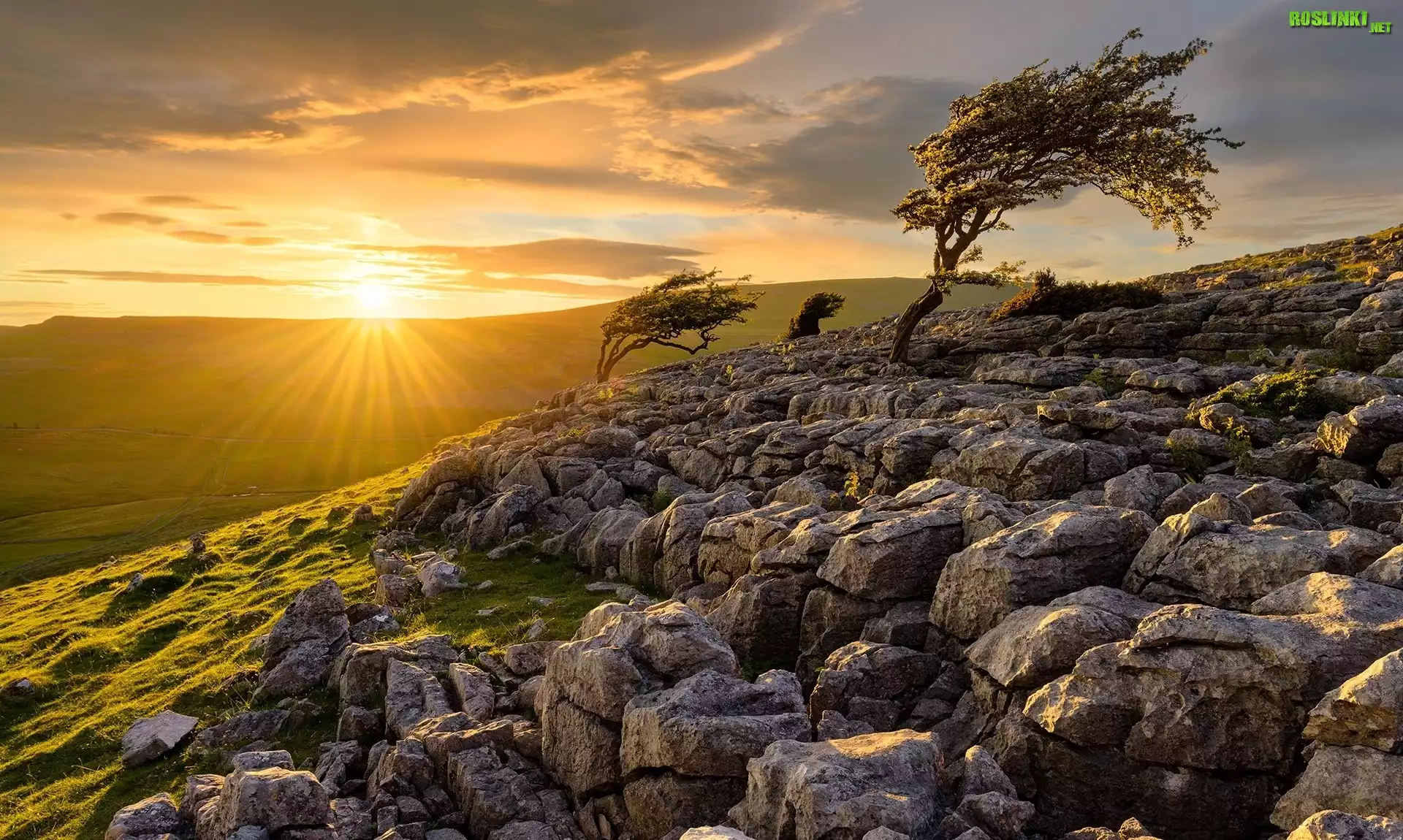Rośliny: Wzgórza, Park Narodowy Yorkshire Dales, Drzewa, Kamienie, Wschód słońca, Chmury, Anglia