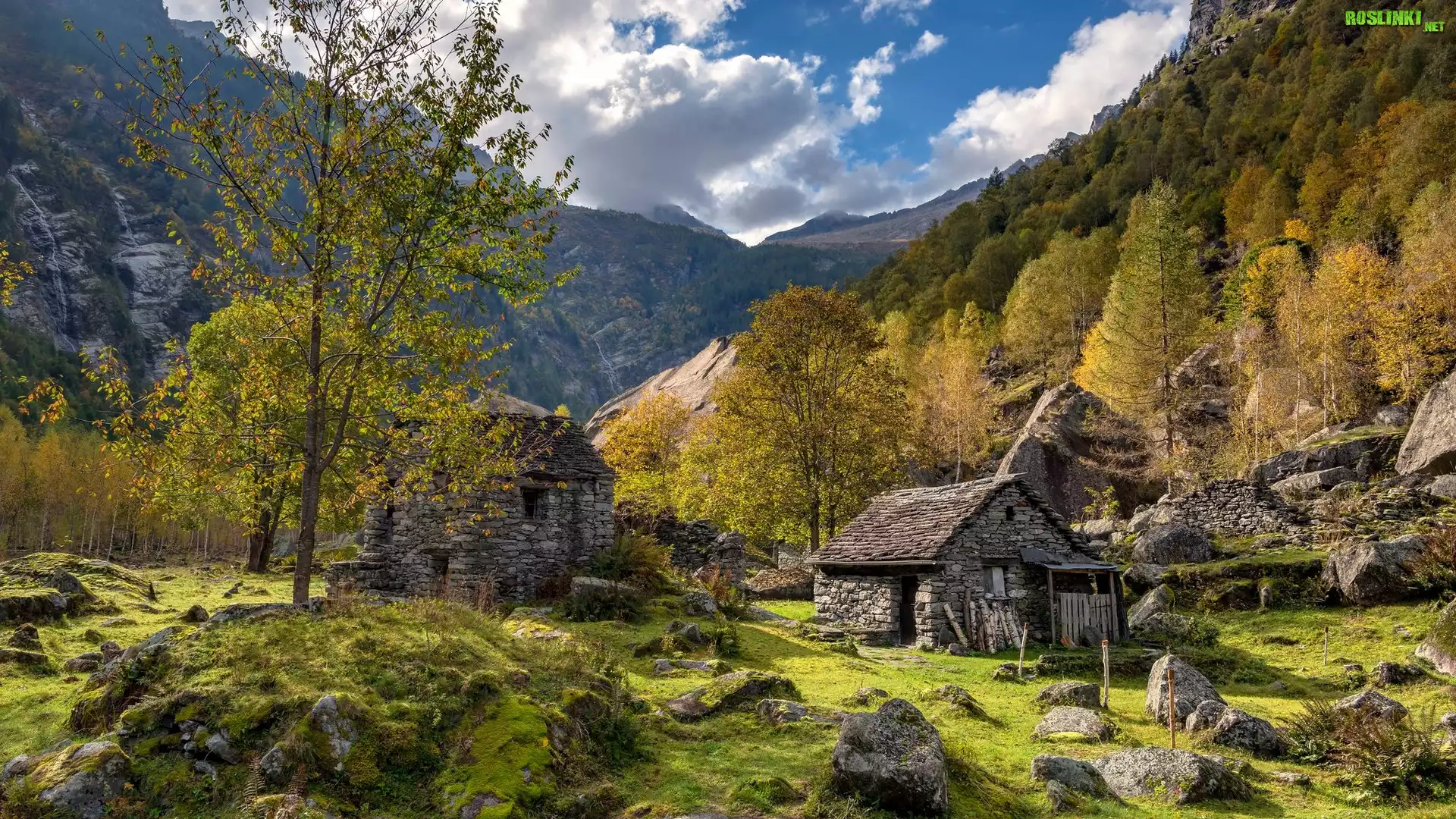 Rośliny: Góry, Drzewa, Kamienne, Domy, Kamienie, Dolina, Valle Maggia, Kanton Tessyn, Szwajcaria