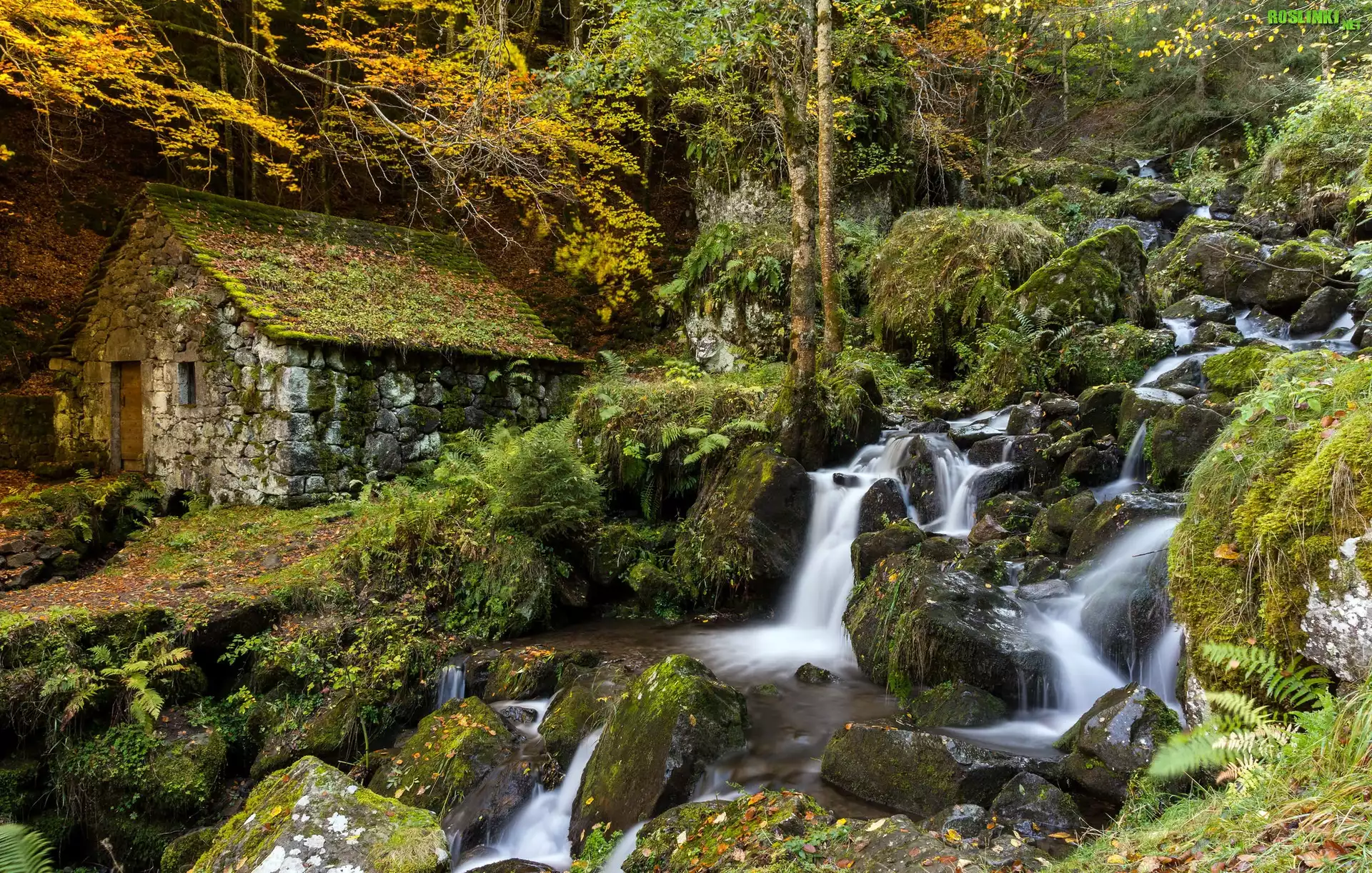 Kamienny, Dom, Rzeka, Omszałe, Kamienie, Drzewa