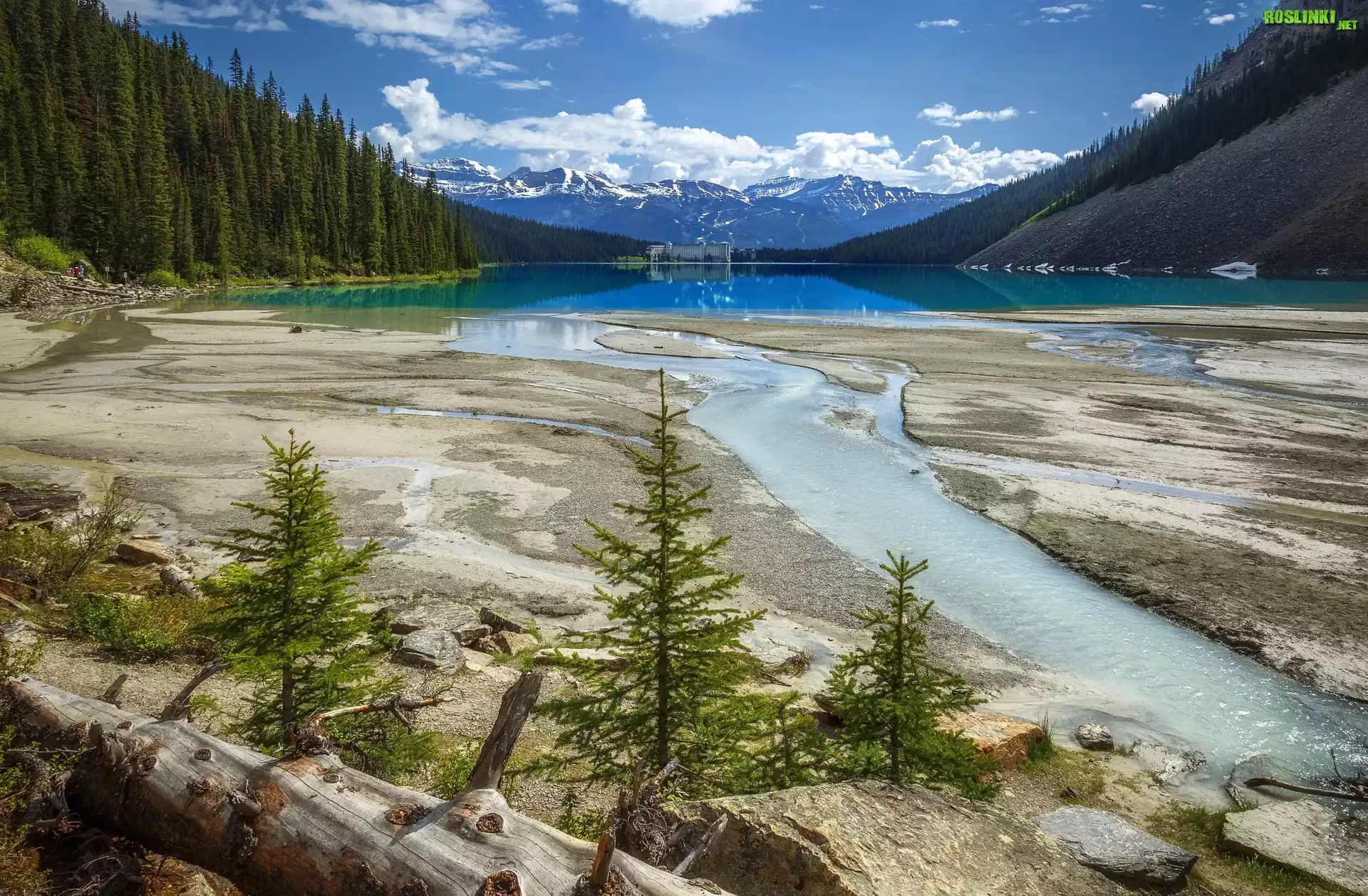 Kanada, Alberta, Park Narodowy Banff, Jezioro Lake Louise, Miejscowość Lake Louise, Hotel Chateau Lake Louise, Góry, Kamienie, Drzewa |