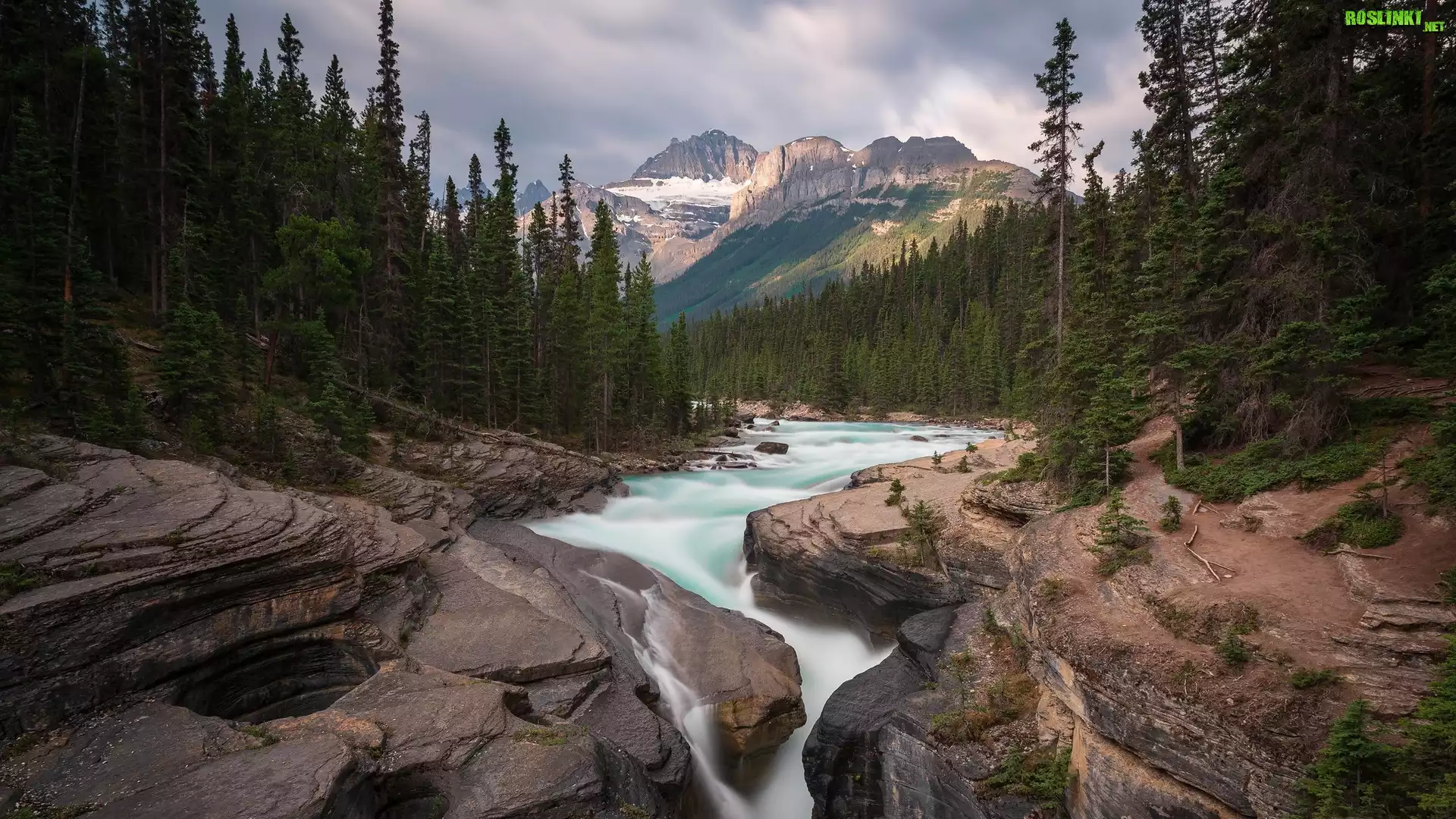 Rzeka, Mistaya River, Skały, Las, Drzewa, Góry, Canadian Rockies, Góra, Mount Sarbach, Park Narodowy Banff, Alberta, Kanada |