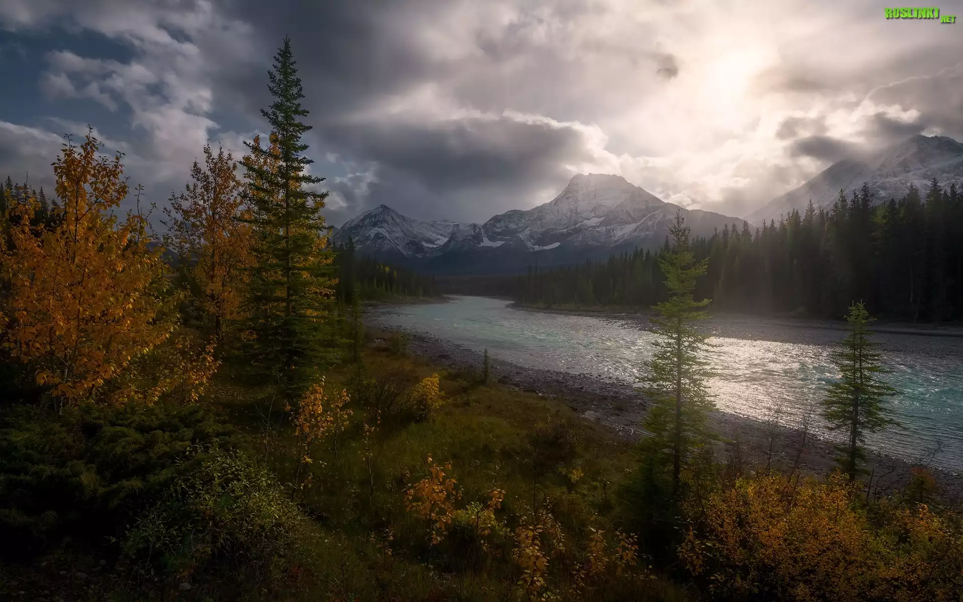 Kanada, Prowincja Alberta, Park Narodowy Jasper, Góry Skaliste, Rzeka, Miette River, Drzewa, Jesień, Ciemne, Chmury |