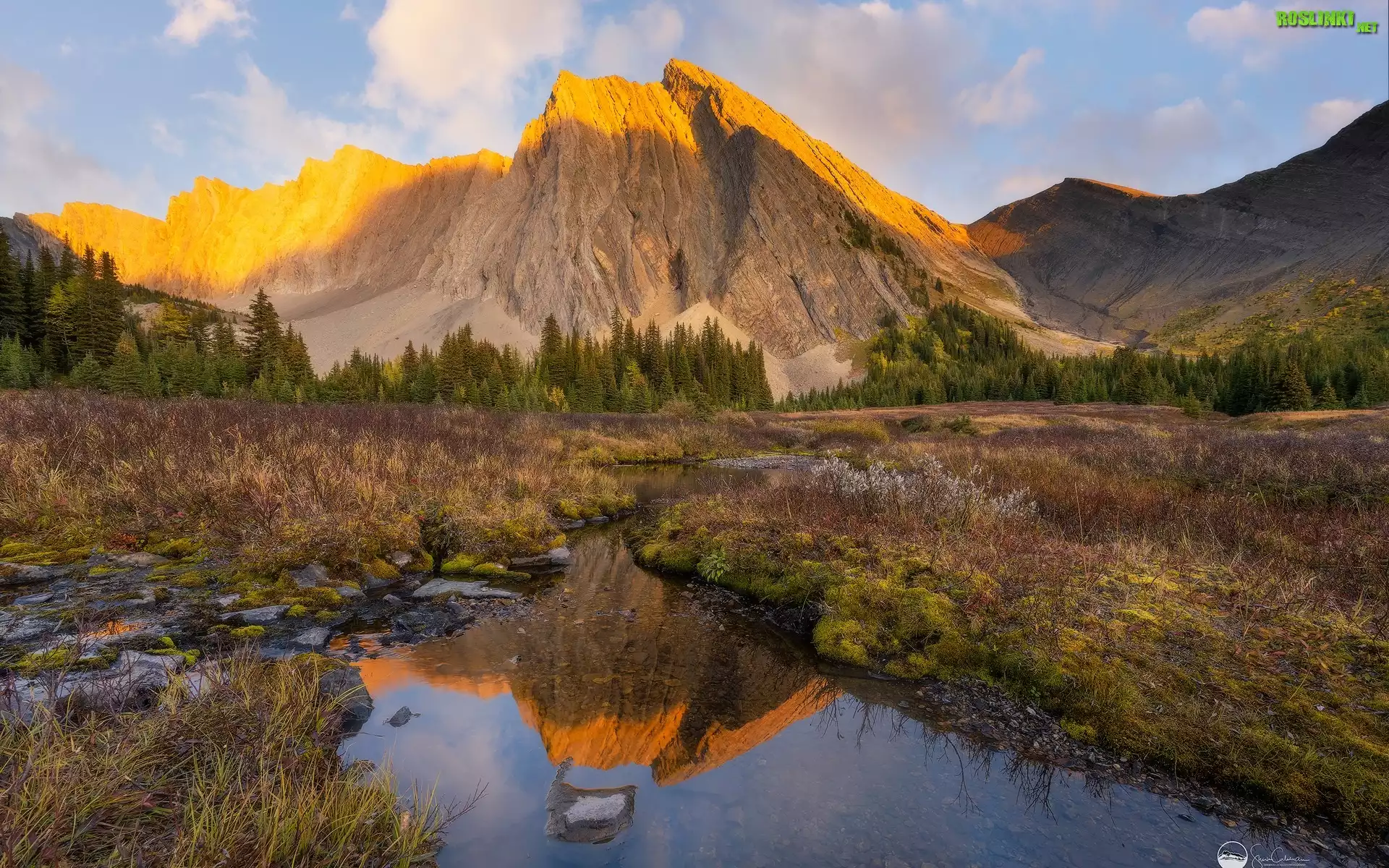 Rośliny: Kanada, Prowincja Alberta, Góry, Kanadyjskie Góry Skaliste, Rzeka, Drzewa, Chmury