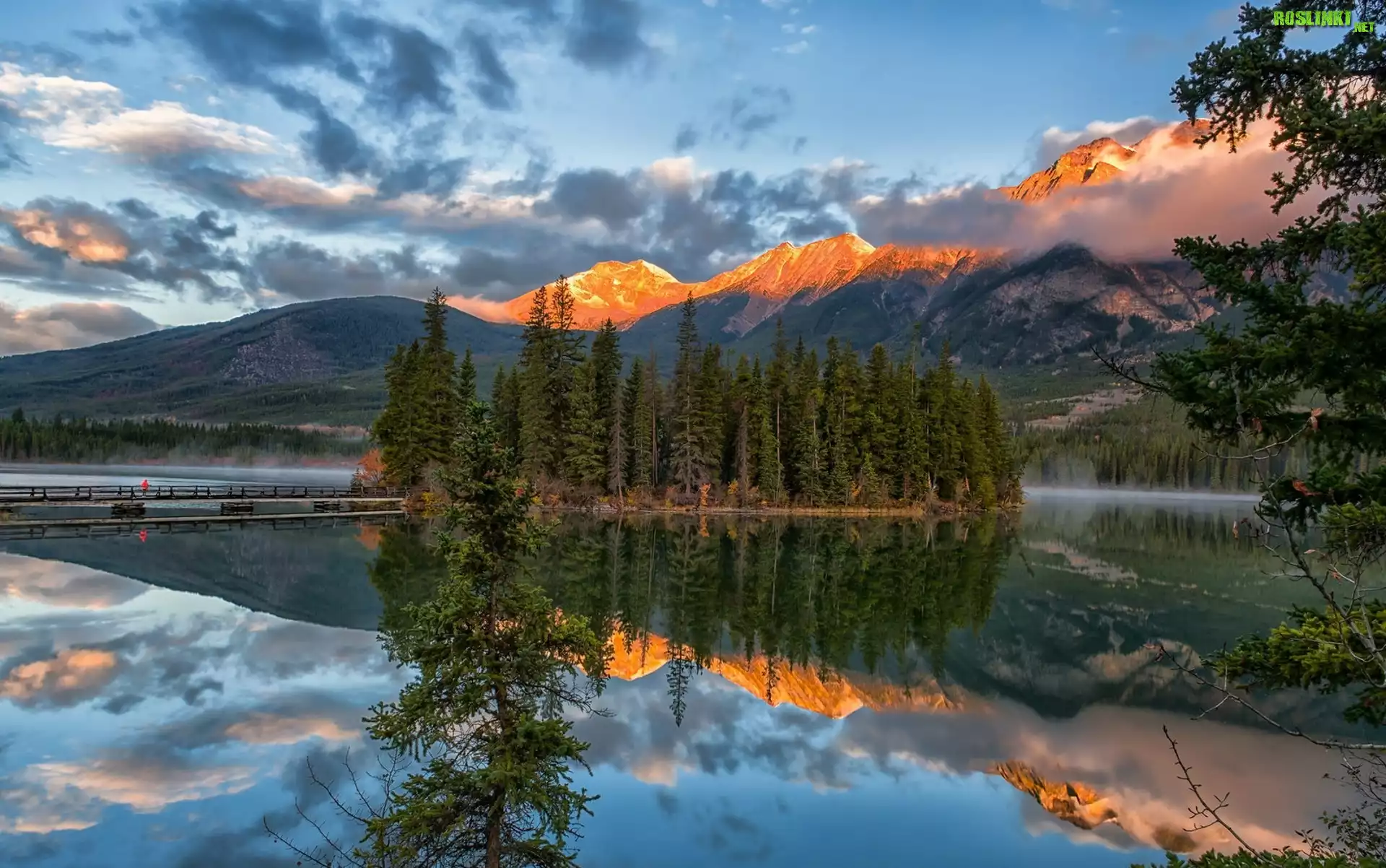 Kanada, Park Narodowy Jasper, Wyspa Pyramid Island, Góry, Jezioro Pyramid Lake, Chmury, Most, Drzewa, Odbicie |