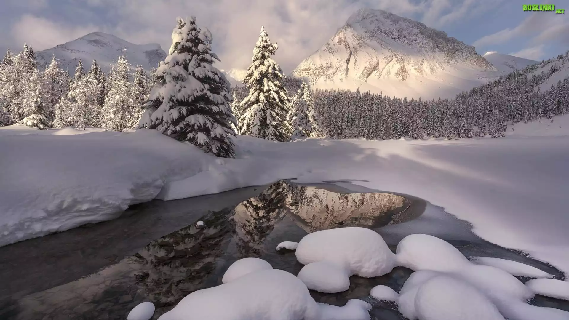 Rośliny: Kanada, Góry, Canadian Rockies, Zima, Las, Drzewa, Rzeka, Śnieg