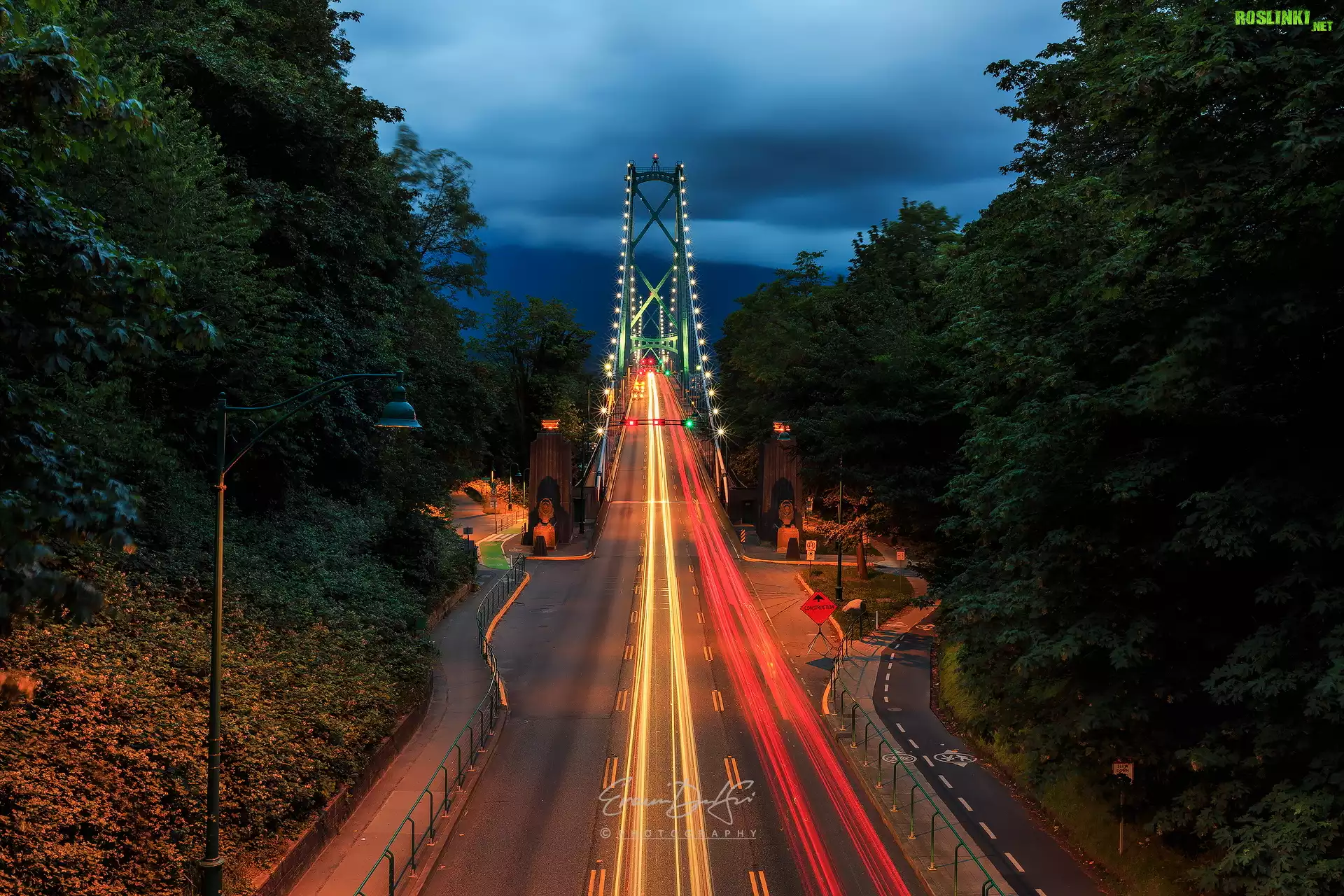 Rośliny: Most, Lions Gate Bridge, Noc, Światła, Drzewa, Vancouver, Kanada