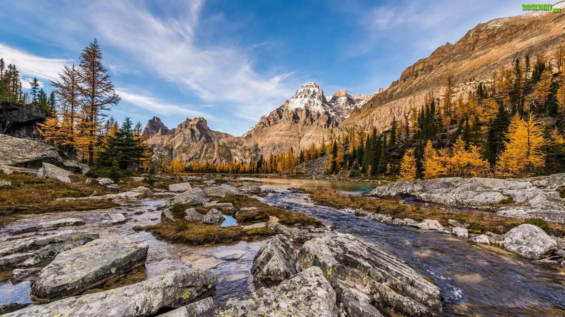 Kanada, Kolumbia Brytyjska, Park Narodowy Yoho, Płaskowyż Opabin Plateau, Góra Mount Huber, Strumień, Góry, Drzewa, Rzeka, Kamienie |