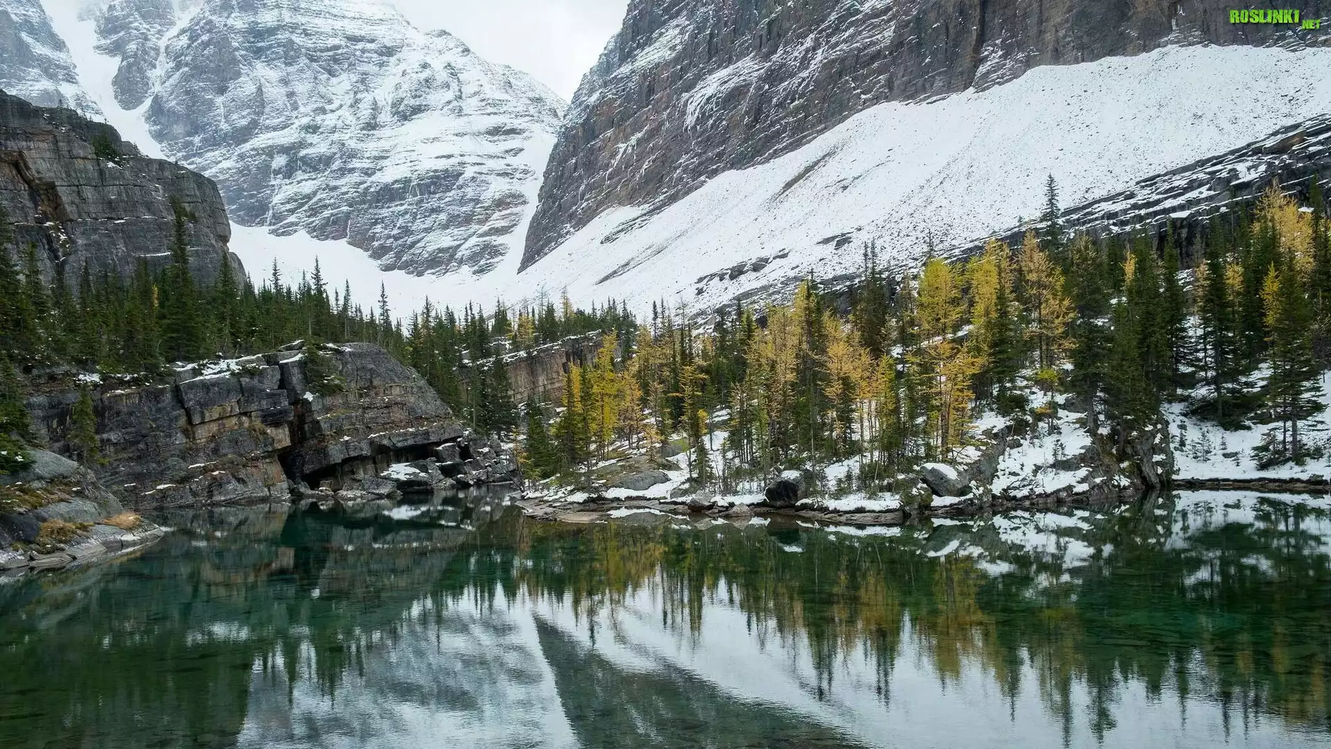 Kanada, Kolumbia Brytyjska, Park Narodowy Yoho, Góry Canadian Rockies, Jezioro O’Hara, Drzewa, Zima, Åšnieg, Odbicie |