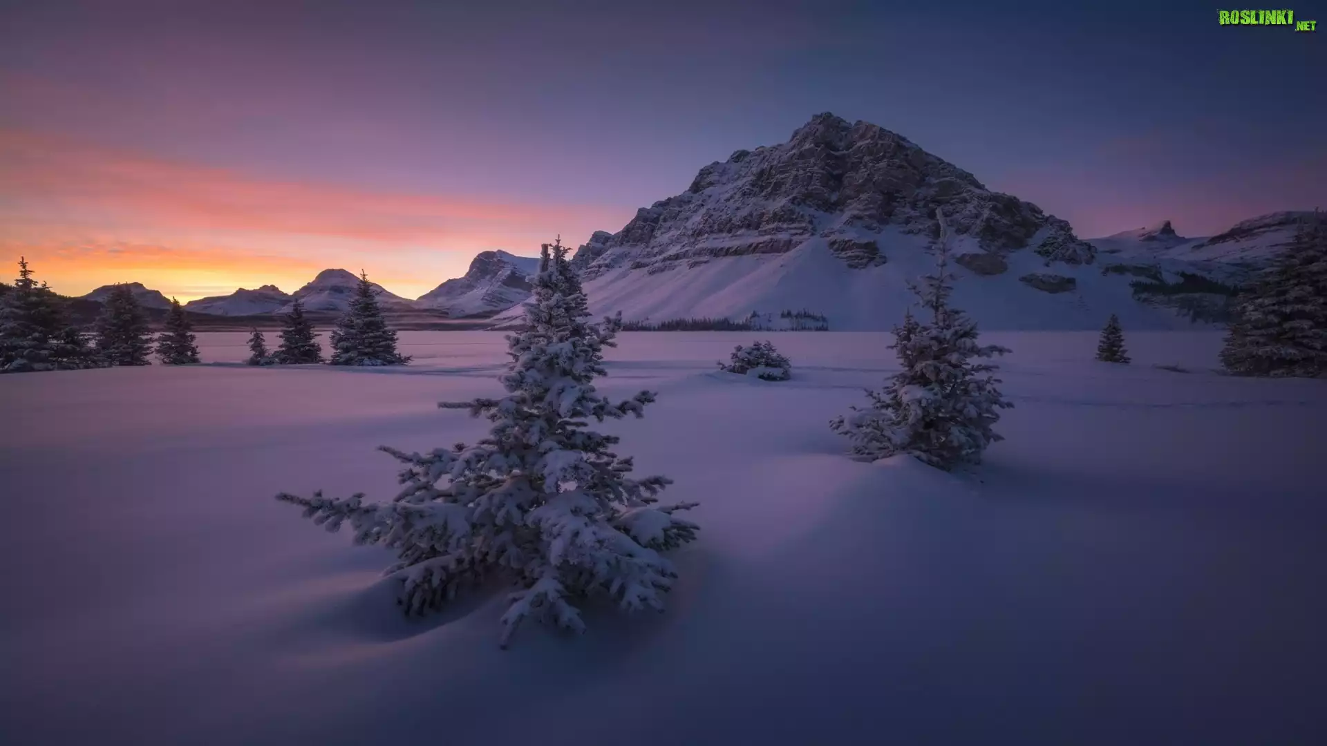 Rośliny: Kanada, Alberta, Park Narodowy Banff, Góra Crowfoot Mountain, Góry, Zima, Wschód słońca, Drzewa