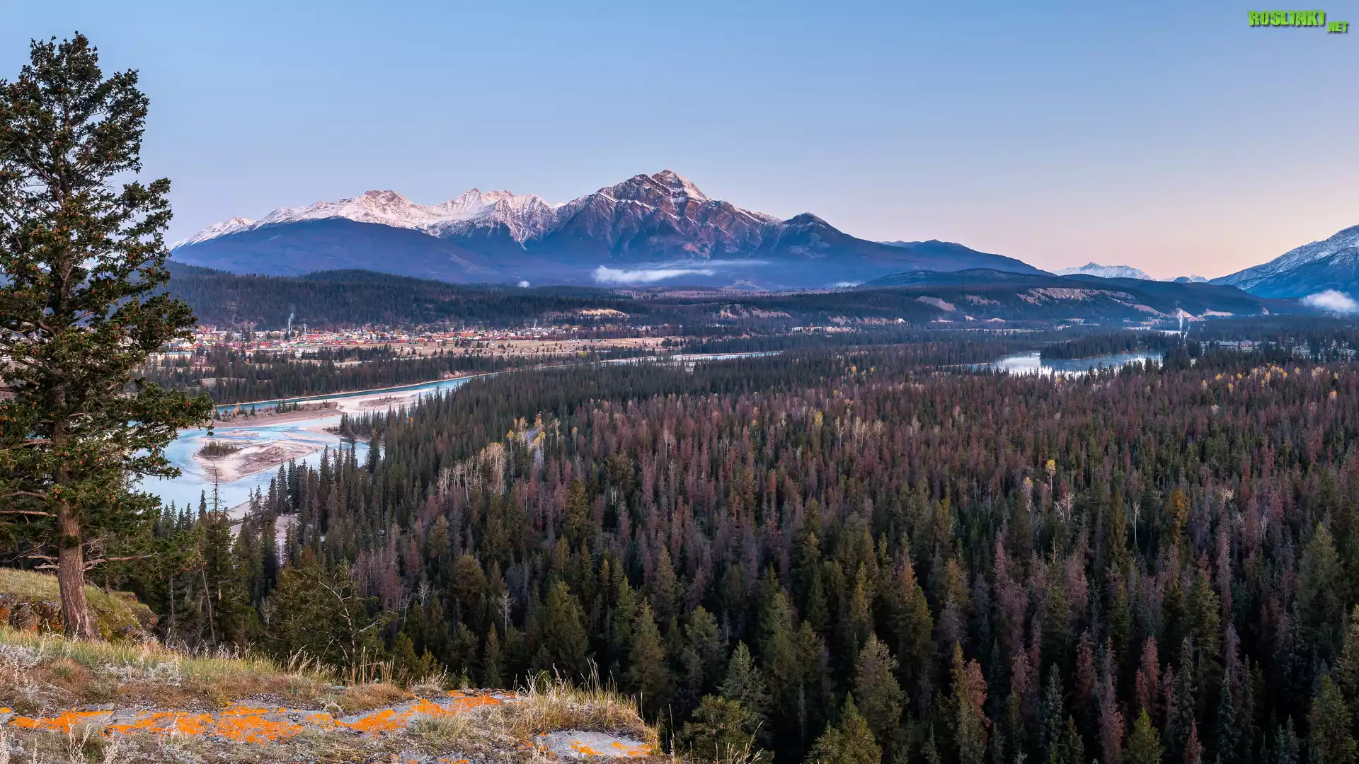 Rośliny: Góry Skaliste, Drzewa, Rzeka, Park Narodowy Jasper, Domy, Alberta, Kanada