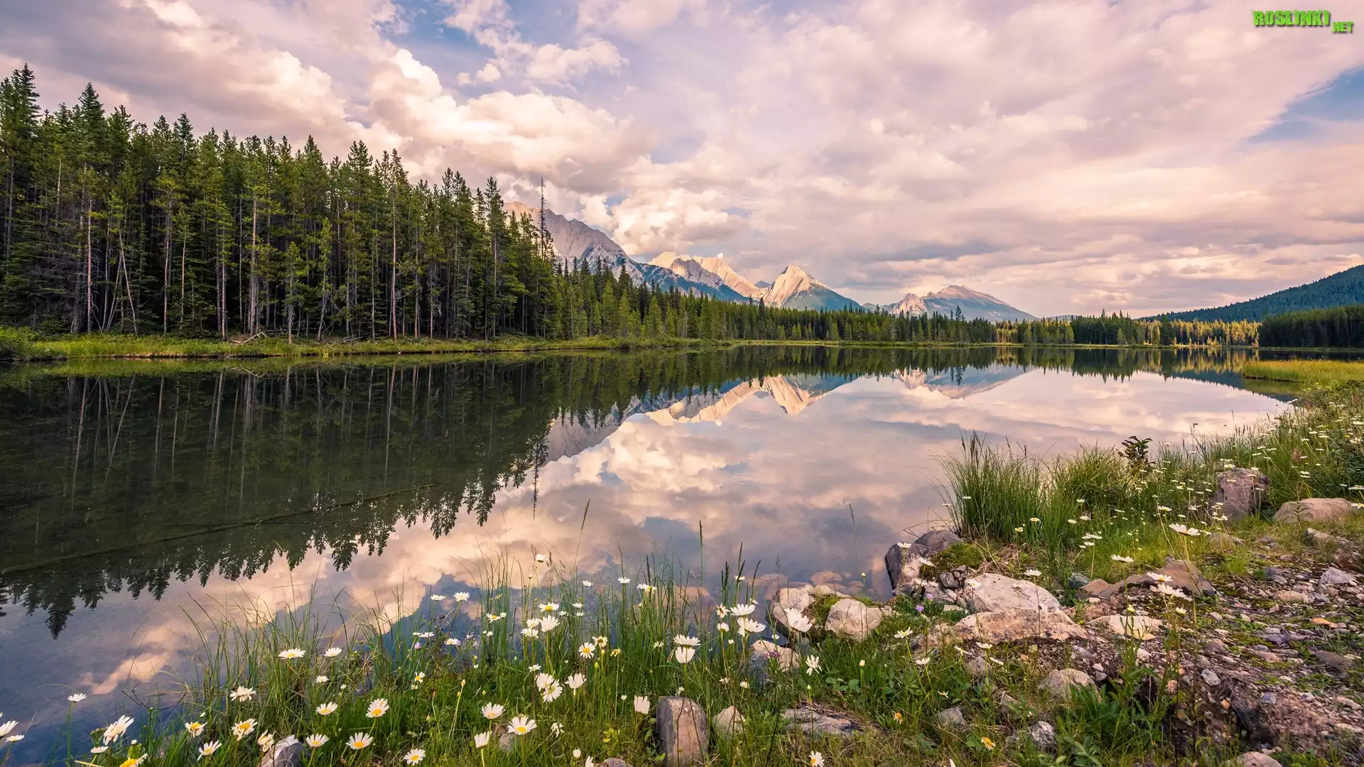 Kanada, Prowincja Alberta, Kananaskis Country, Drzewa, Las, Góry Canadian Rockies, Jezioro Upper Kananaskis Lake, Kamienie, Roślinność, Chmury |