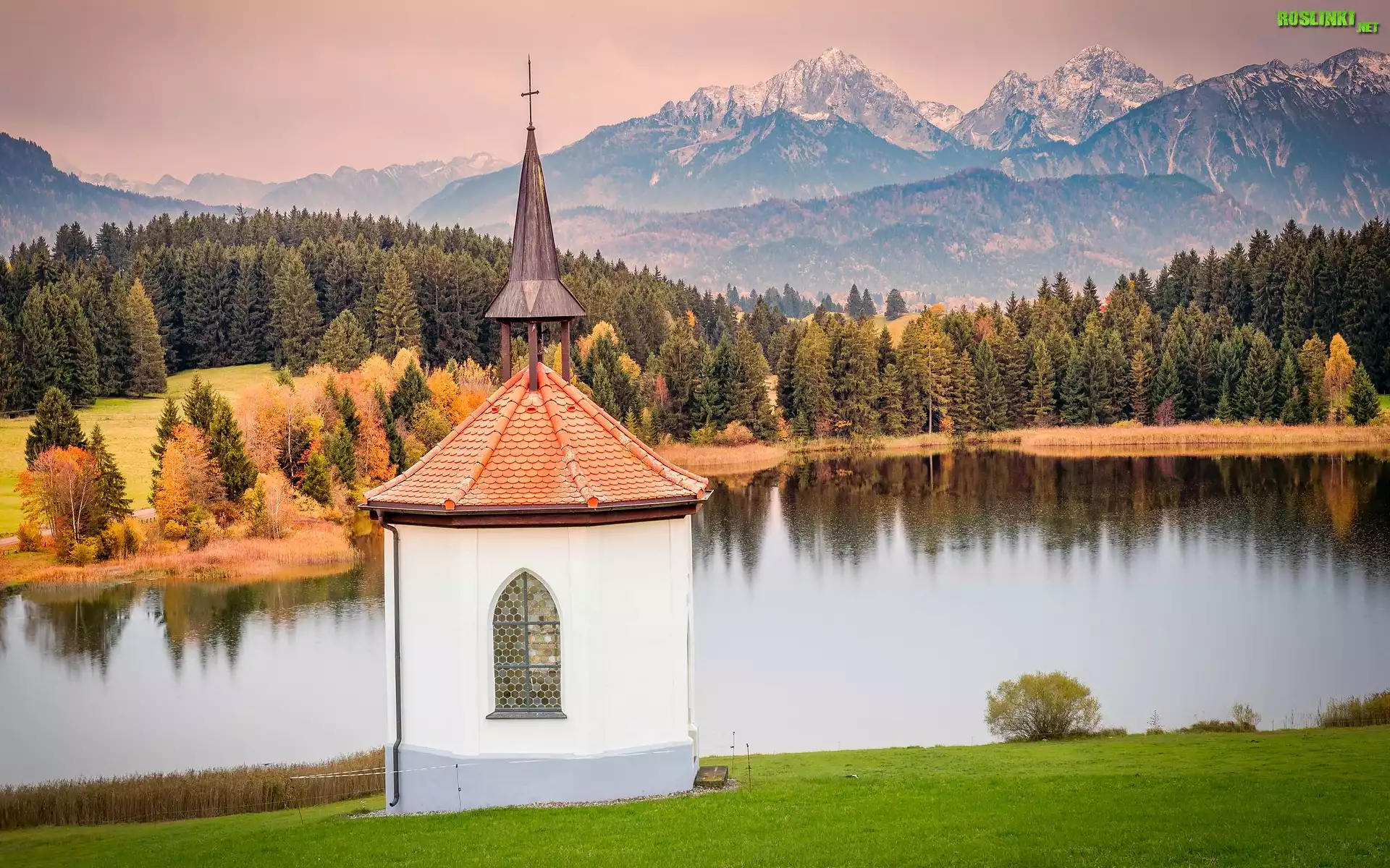 Kaplica, Hegratsried Chapel, Jezioro Hegratsried, Góry, Alpy, Lasy, Drzewa, Jesień, Halblech, Bawaria, Niemcy |