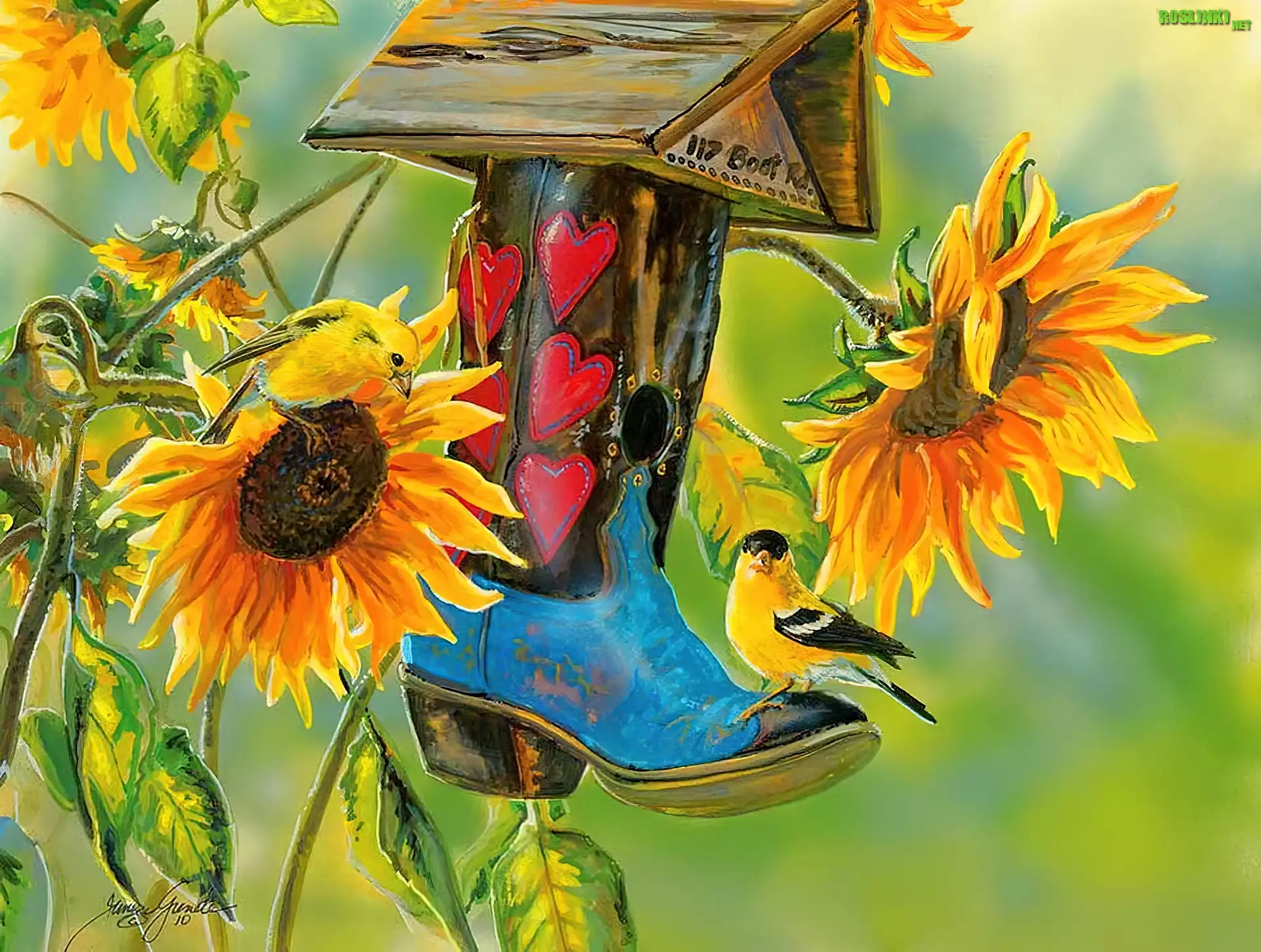 Rośliny: Karmnik, But, Słoneczniki, Ptak