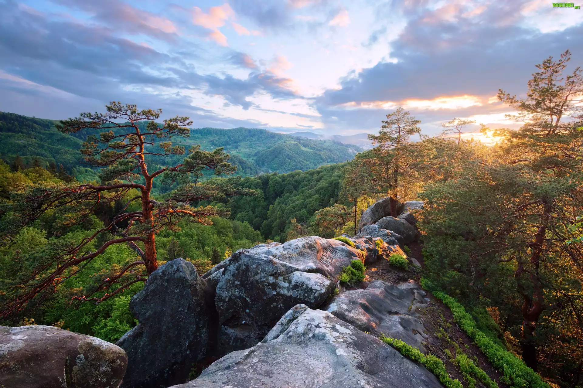 Rośliny: Ukraina, Karpaty, Skała, Las, Góry, Drzewa, Zachód słońca