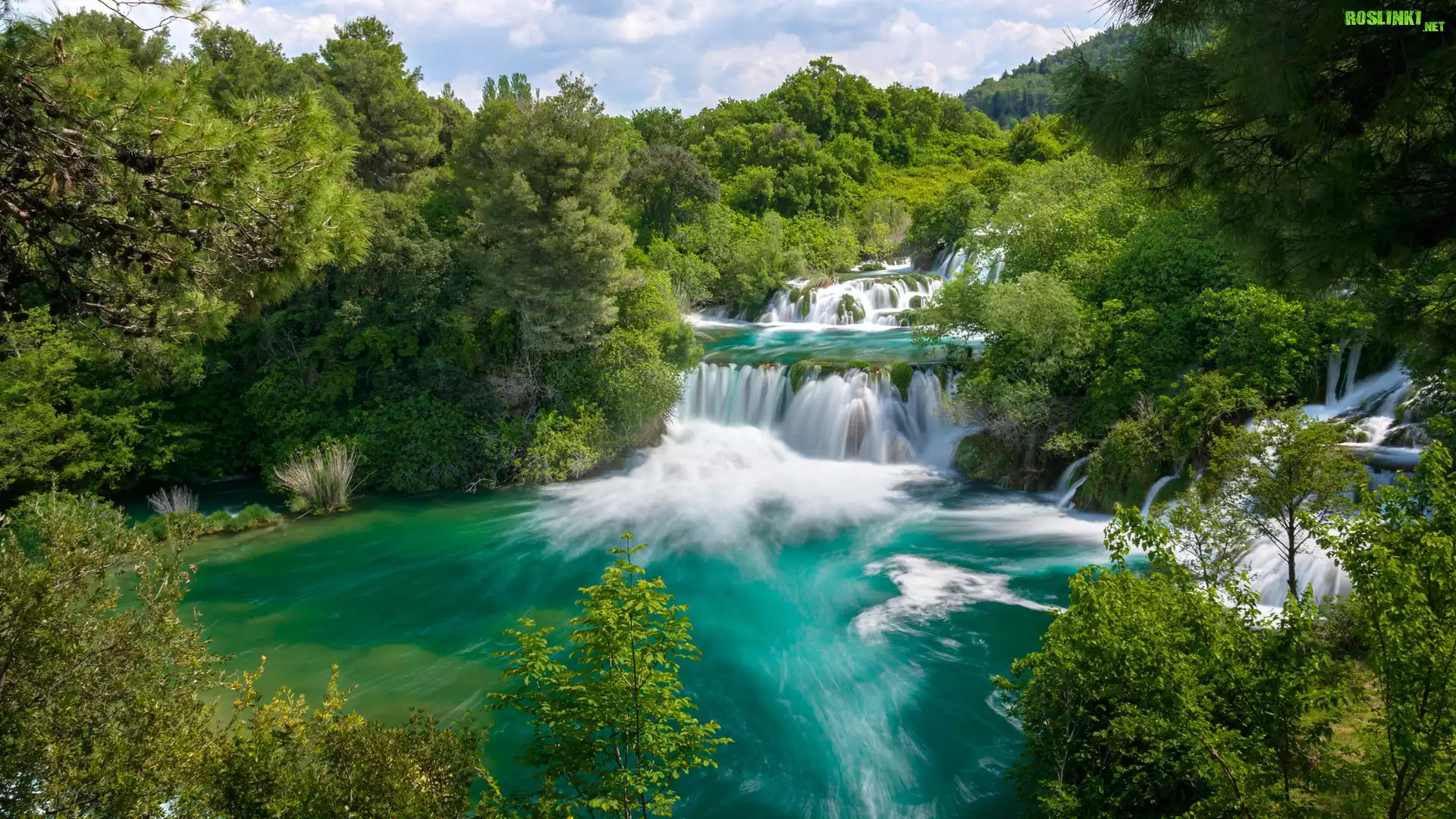 Rośliny: Kaskada, Wodospad, Drzewa, Rzeka Krka, Park Narodowy Krka, Chorwacja