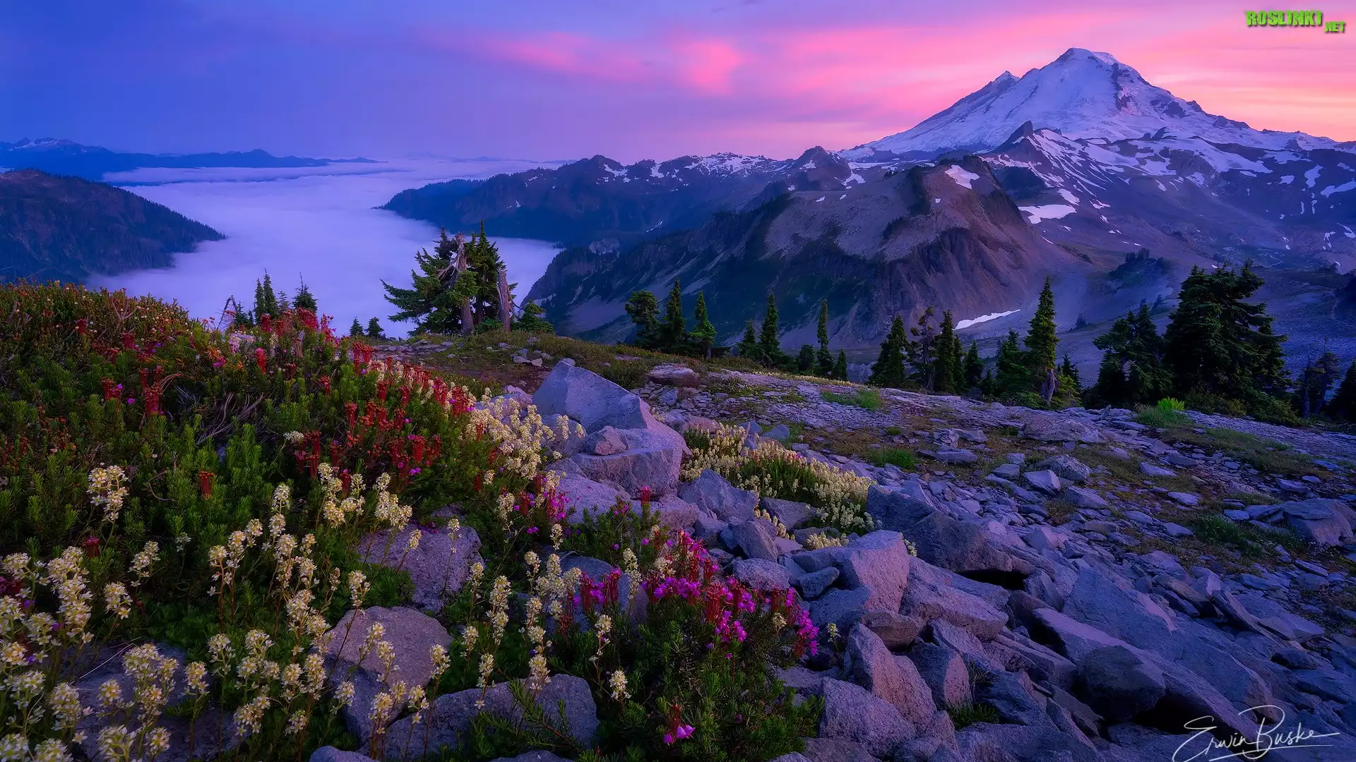 Góra, Mount Baker, Góry Kaskadowe, Skały, Dolina, Mgła, Kwiaty, Drzewa, Stan Waszyngton, Stany Zjednoczone |