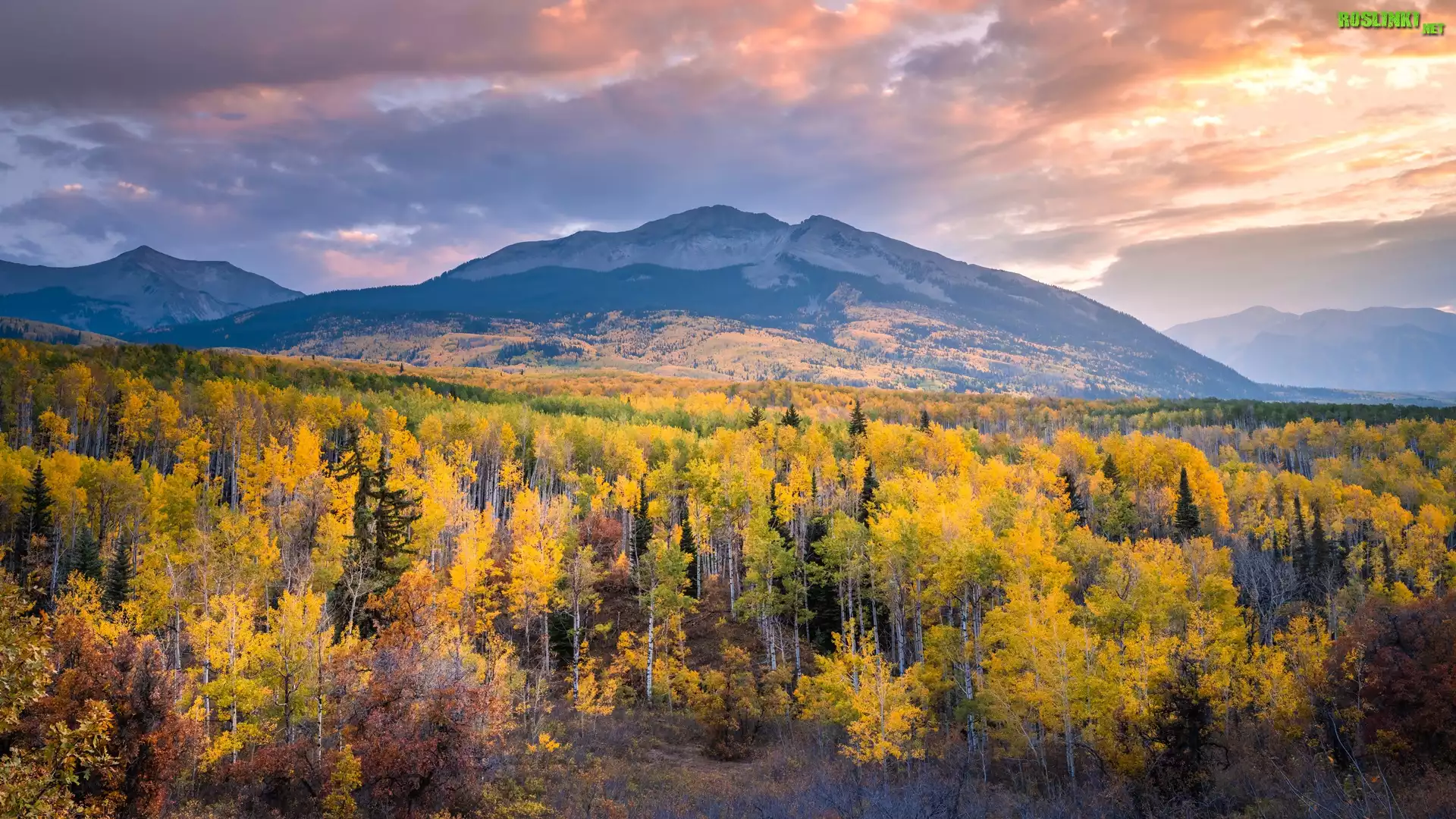 Stany Zjednoczone, Kolorado, Przełęcz, Kebler Pass, Góry, Drzewa, Roślinność, Lasy, Jesień, Wschód słońca, Chmury |
