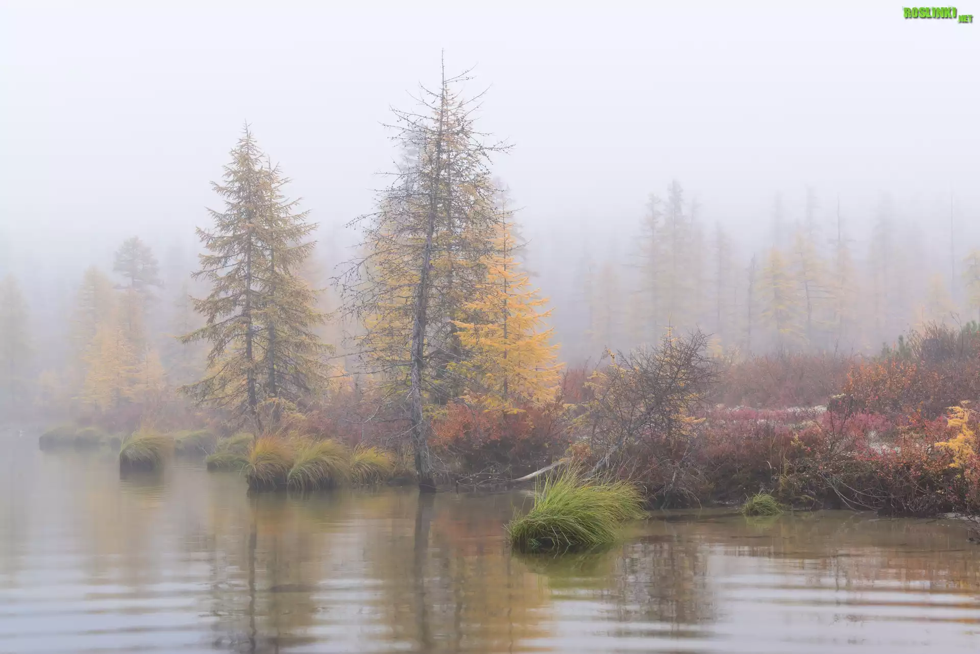Mgła, Drzewa, Kępki, Trawy, Jezioro Jack London, Kołyma, Obwód magadański, Rosja