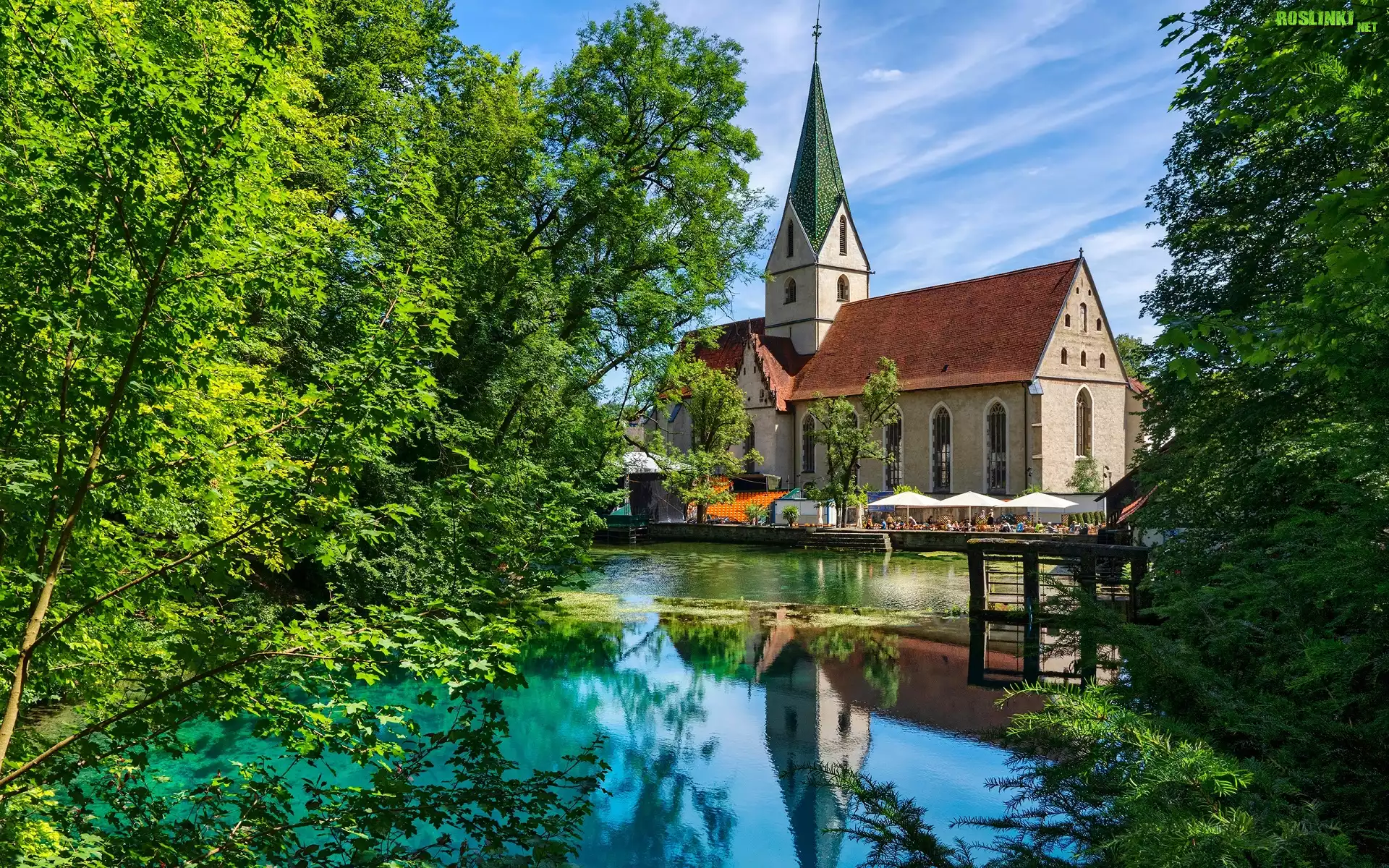 Rośliny: Kościół, Klasztor, Staw, Drzewa, Blaubeuren, Badenia-Wirtembergia, Niemcy