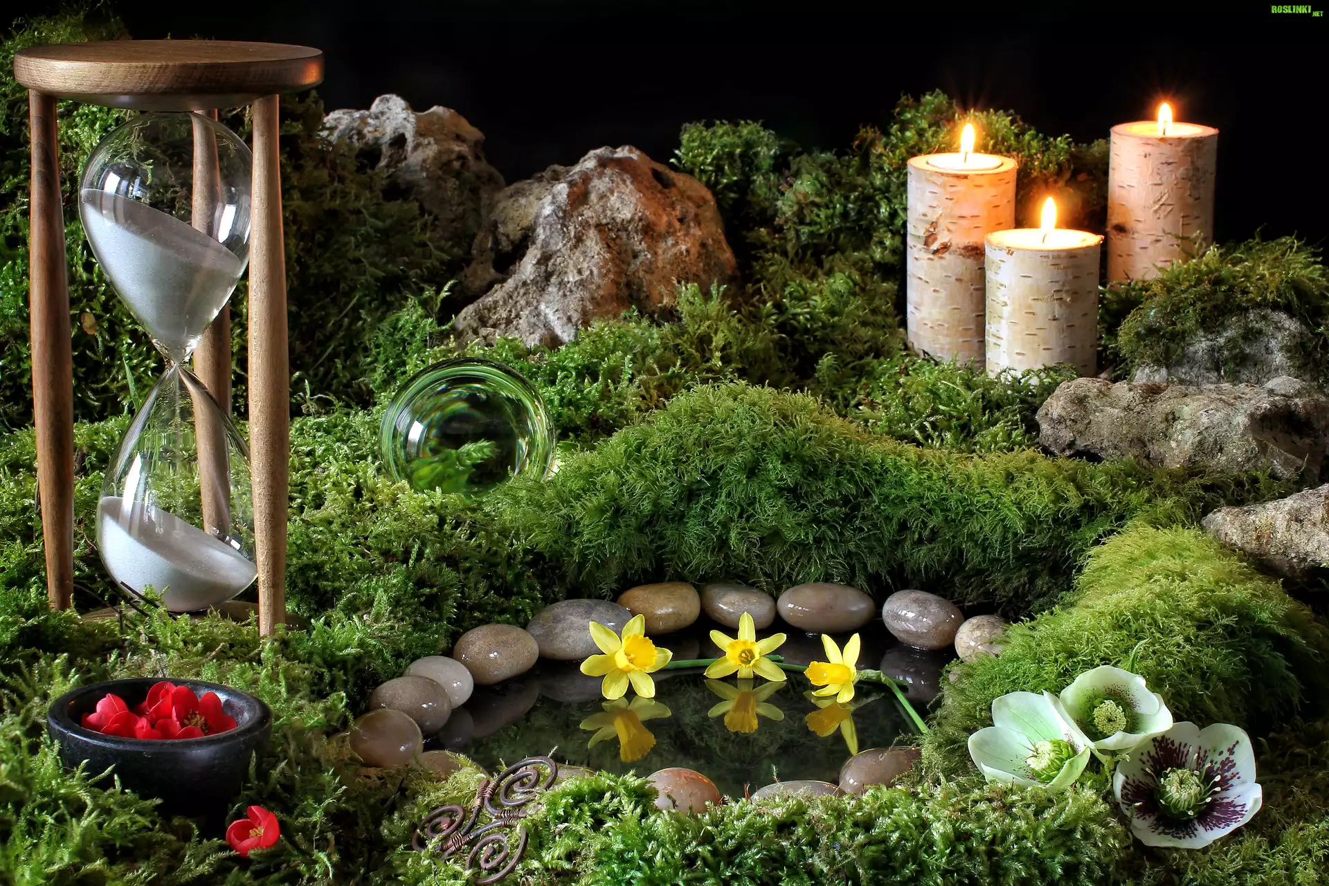 Rośliny: Klepsydra, Mech, Sadzawka, Żonkile, Świece, Kompozycja