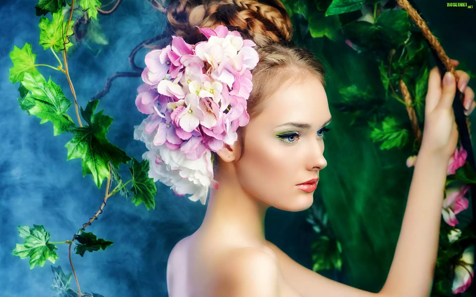 Rośliny: Kobieta, Kwiaty, We, Włosach, Liście, Ogród
