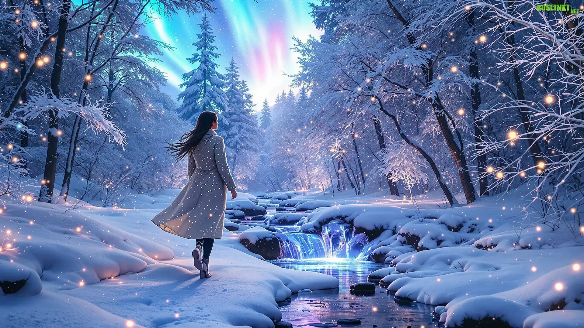Rośliny: Rzeka, Kaskada, Zima, Kobieta, Zorza polarna, Drzewa