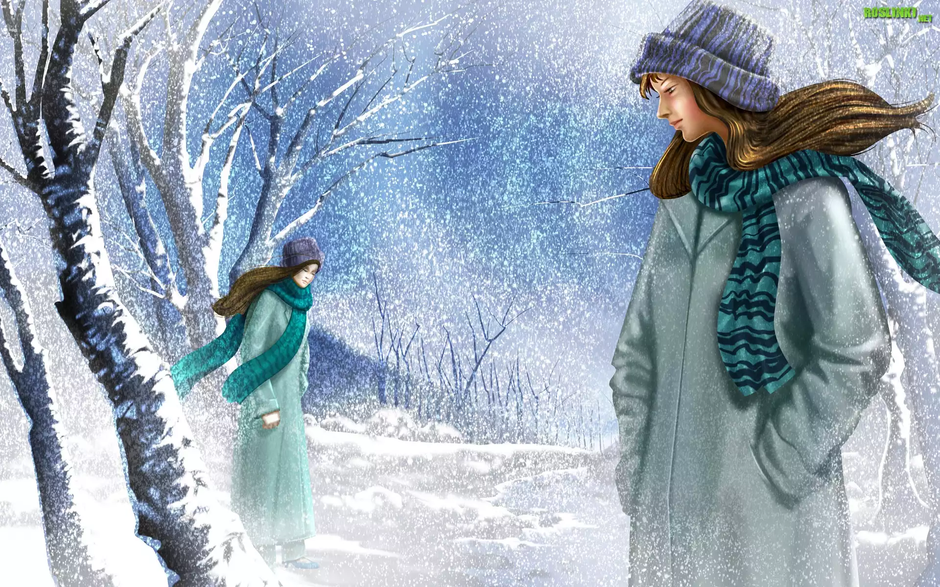 Kobiety, Park, Drzewa, Zima, Grafika