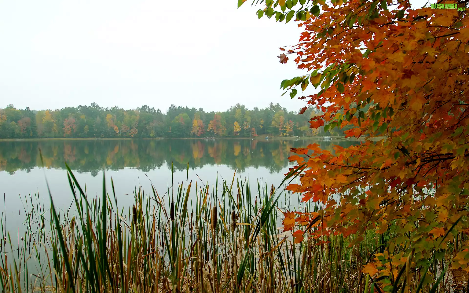 Rośliny: Kolorowe, Drzewo, Gałęzie, Liście, Jezioro, Tatarak
